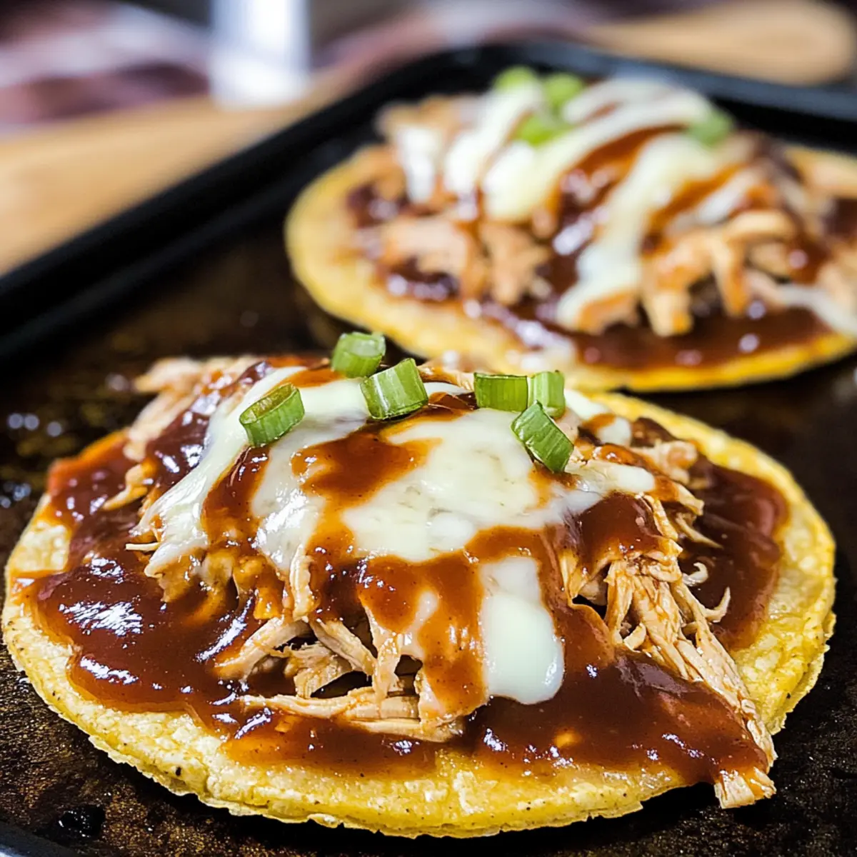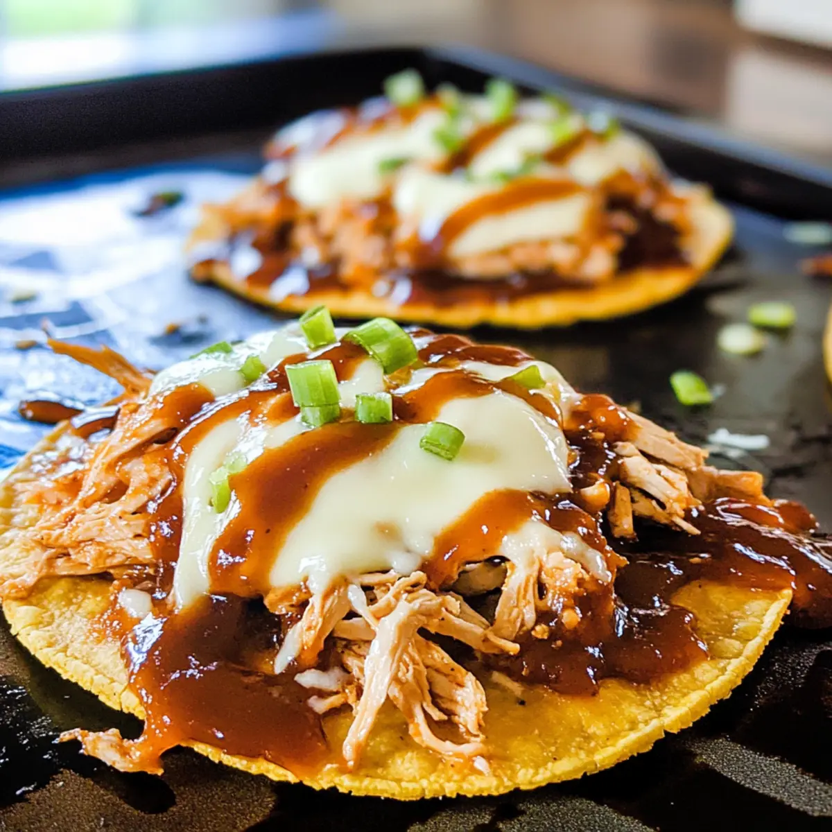 Träufeln Sie die restlichen ½ Tasse BBQ-Sauce über die heißen Tostadas und garnieren Sie sie nach Belieben mit dünn geschnittenen Frühlingszwiebeln. Diese frischen Aromen ergänzen die BBQ-Hühnchen-Tostadas wunderbar und verleihen dem Gericht eine lebendige Note. Servieren Sie sofort und genießen Sie das köstliche Ergebnis!