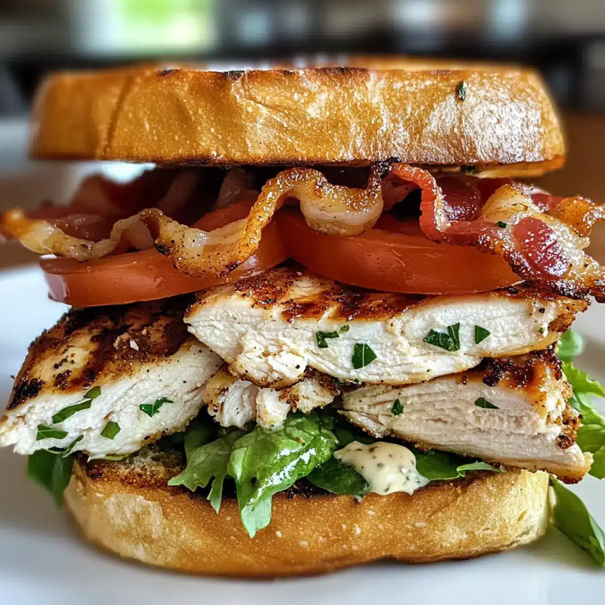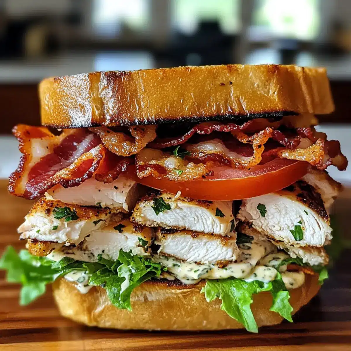Verteile die Kräuter-Mayonnaise gleichmäßig auf jeder Scheibe des getoasteten Brotes. Schichte frischen Salat, reife Tomatenscheiben, das saftig gebratene Hähnchen und den knusprigen Speck darauf. Setze die zweite Brotscheibe auf und serviere den beladenen Hähnchenclub sofort für ein unvergleichliches Geschmackserlebnis.
