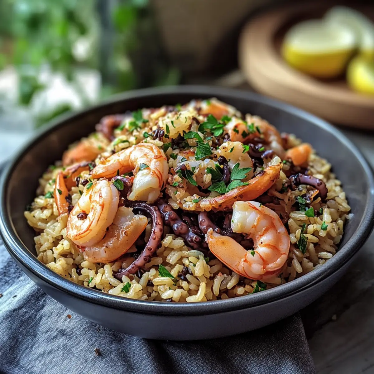 Venere-Reis mit Krakenarmen und Garnelen genießen