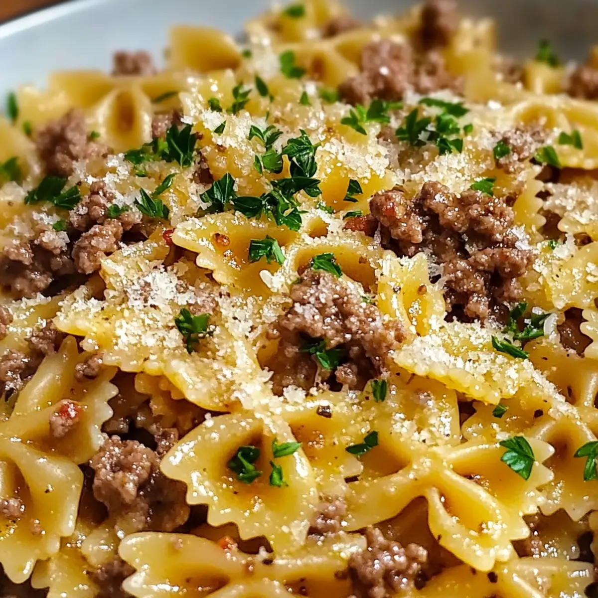 Knoblauchbutter-Schmetterlingsnudeln mit Hackfleisch genießen