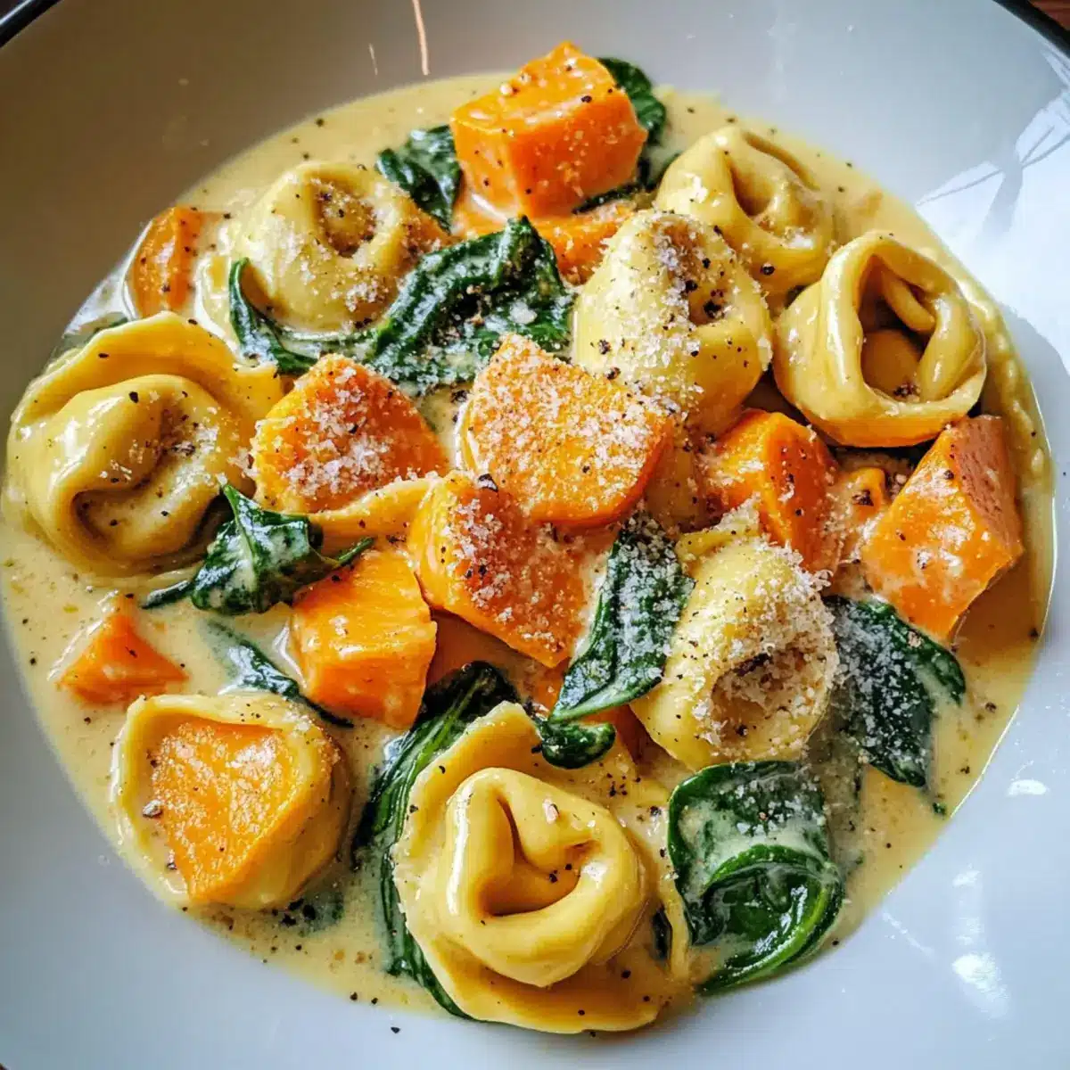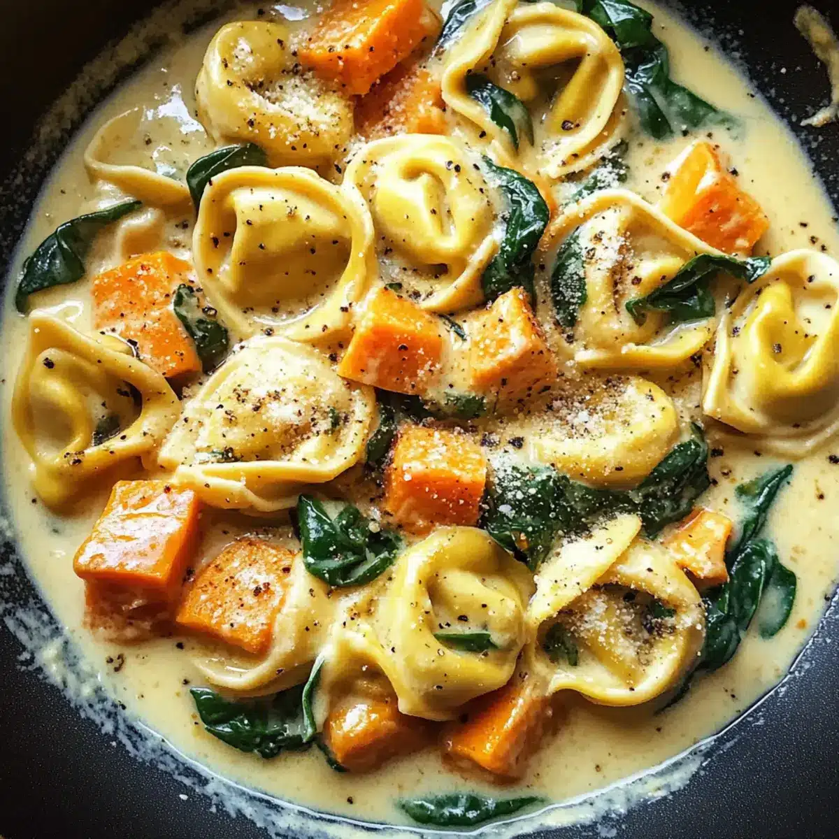 Cremige Pfannen-Tortellini mit Süßkartoffel und Spinat