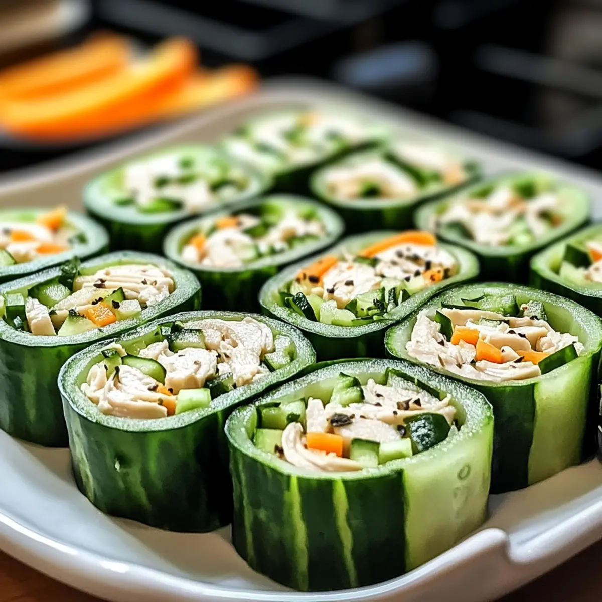Knuspriger Hähnchensalat Gurken-Röllchen für gesunde Snacks