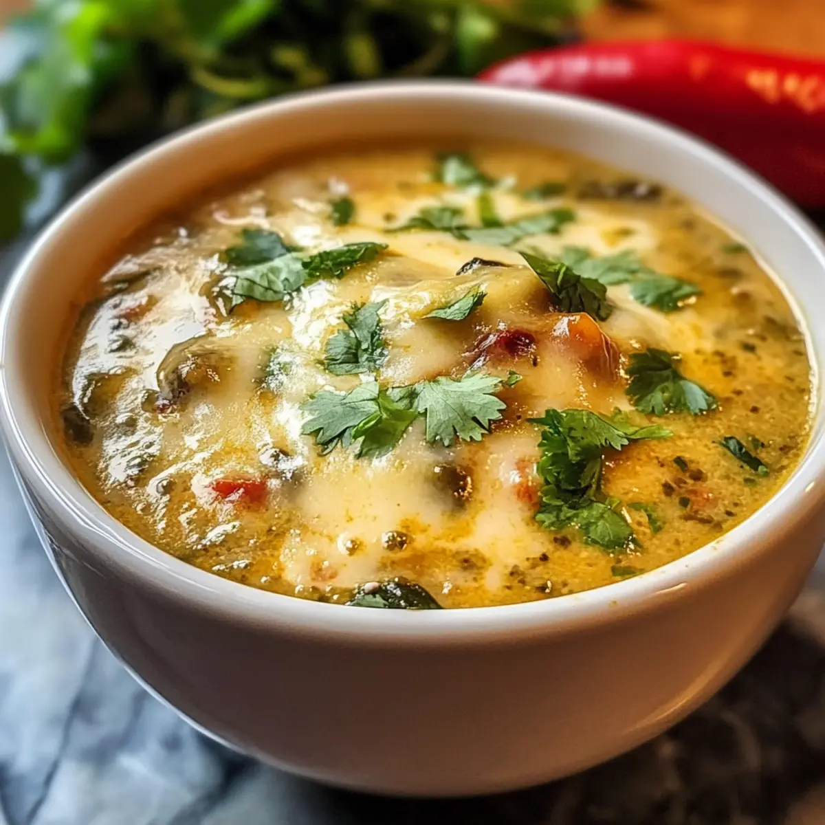 Einfachheit, die überzeugt: Die Zubereitung dieser Chile Relleno Suppe ist kinderleicht und erfordert keine fortgeschrittenen Kochkünste. Vielseitige Anpassungen: Sie können die Zutaten nach Lust und Laune variieren, um ein vegetarisches Gericht zu kreieren. Reiche, würzige Aromen: Die Kombination aus gerösteten Paprika, Gewürzen und cremigem Käse sorgt für ein geschmackliches Erlebnis, das garantiert begeistert. Schnell und unkompliziert: Perfekt für ein schnelles Abendessen, ohne dabei auf Qualität zu verzichten. Komfort in jedem Bissen: Diese Suppe wird nicht nur Ihr Herz, sondern auch Ihre Geschmacksknospen erwärmen — perfekt für gesellige Abende mit Freunden! Entdecken Sie auch unsere Tipps für lagerfreundliche Rezepte und bereiten Sie das perfekte Abendessen vor!