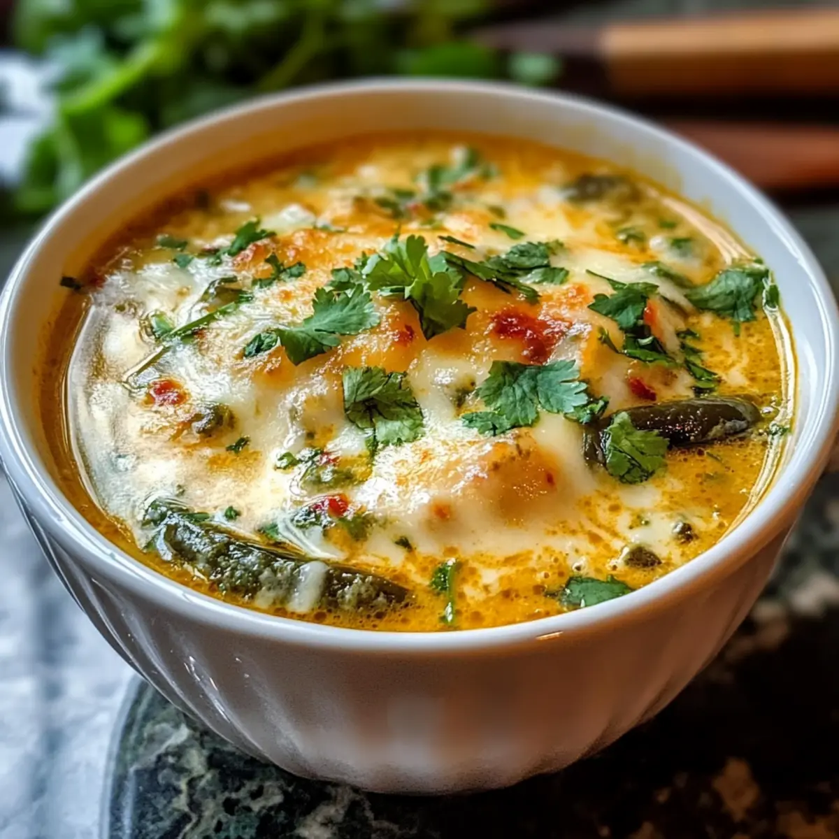Bestreuen Sie die fertige Chile Relleno Suppe mit frisch gehacktem Koriander und servieren Sie sie heiß. Diese cremige, herzhafte Suppe ist perfekt für gesellige Abende und wärmt von innen — ein Genuss, den niemand ablehnen kann!