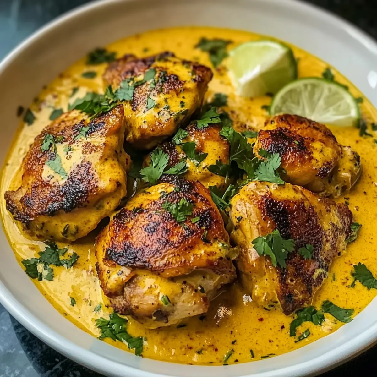 - Das angebratene Hühnchen in die Sauce legen und 5 Minuten sanft köcheln lassen.