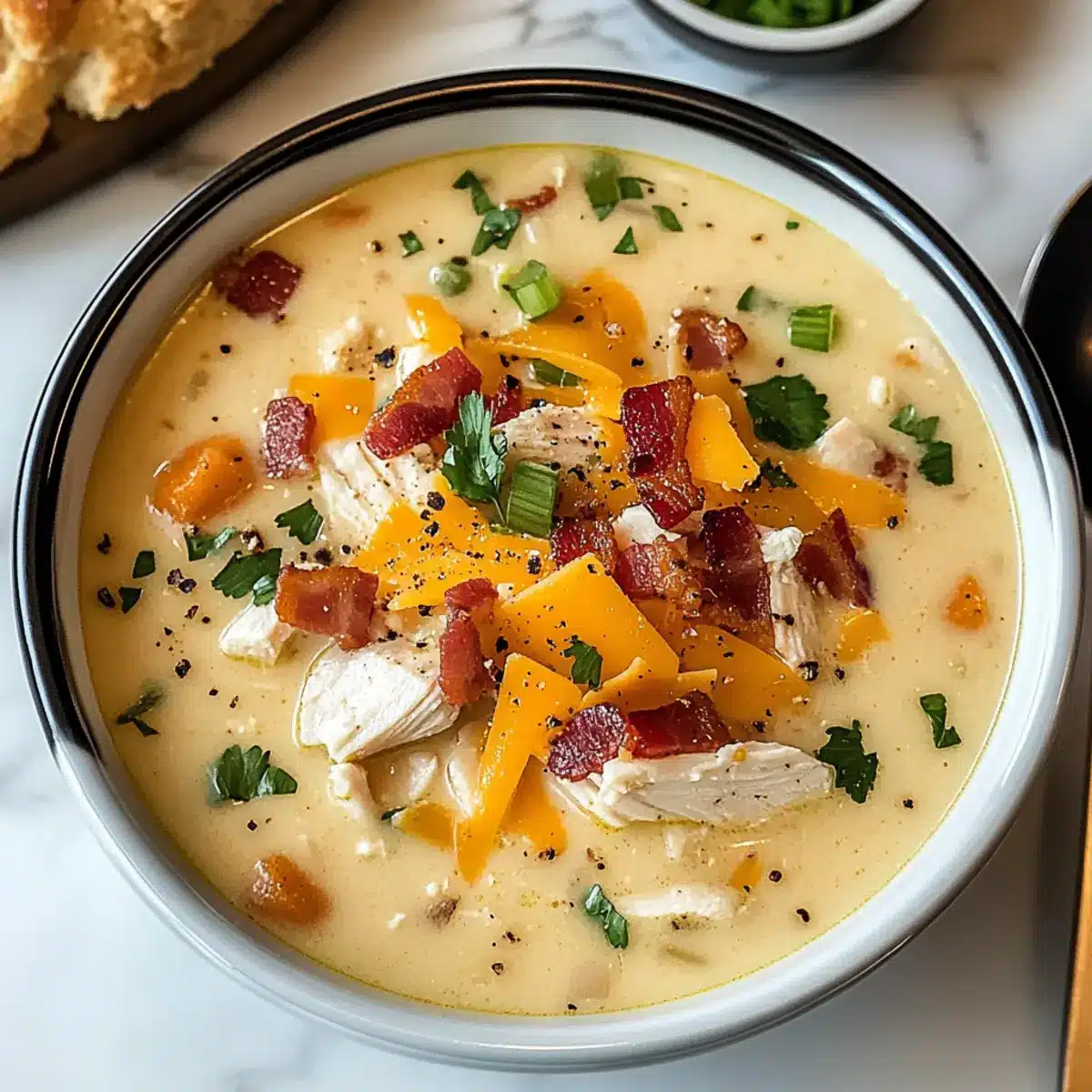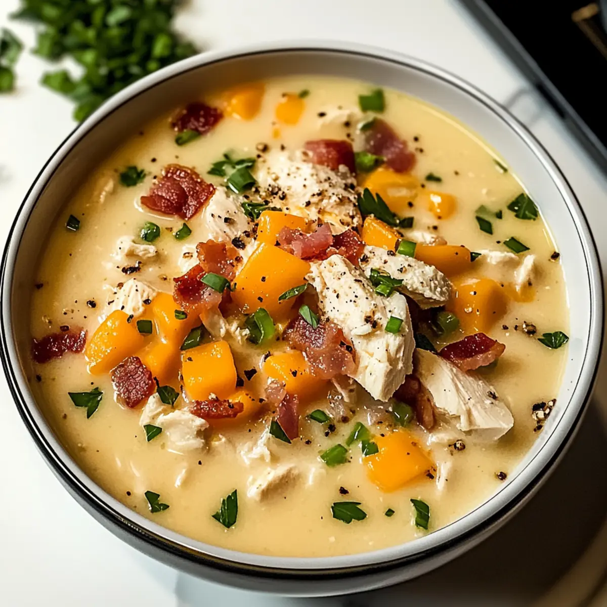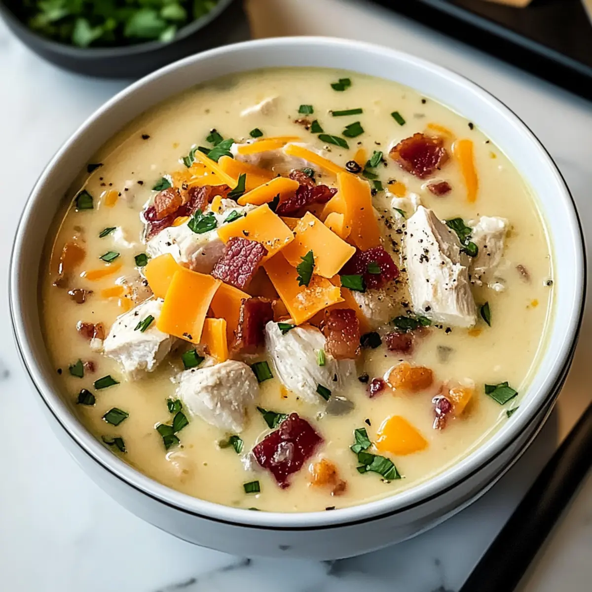 Wohlfühlfaktor: Diese Cremige Crac-Hühnchensuppe ist der perfekte Trost für kalte Tage und schafft schnell eine gemütliche Atmosphäre. Einfache Zubereitung: Selbst Anfänger in der Küche werden mit diesem Rezept mühelos zurechtkommen. Reichhaltiger Geschmack: Die Kombination aus saftigem Hähnchen, knusprigem Speck und cremigem Käse sorgt für ein Geschmackserlebnis, das jeden begeistert. Familienfreundlich: Ideal für ein gemeinsames Abendessen mit der ganzen Familie; sie wird auch den kleinsten Esser überzeugen! Vielfältige Variationen: Füge Gemüse oder Gewürze hinzu, um deine eigene Note zu kreieren und die Gesundheit zu fördern. Entdecke auch, wie du mit diese Tipps für die perfekte Suppe noch mehr Geschmack herauskitzeln kannst!
