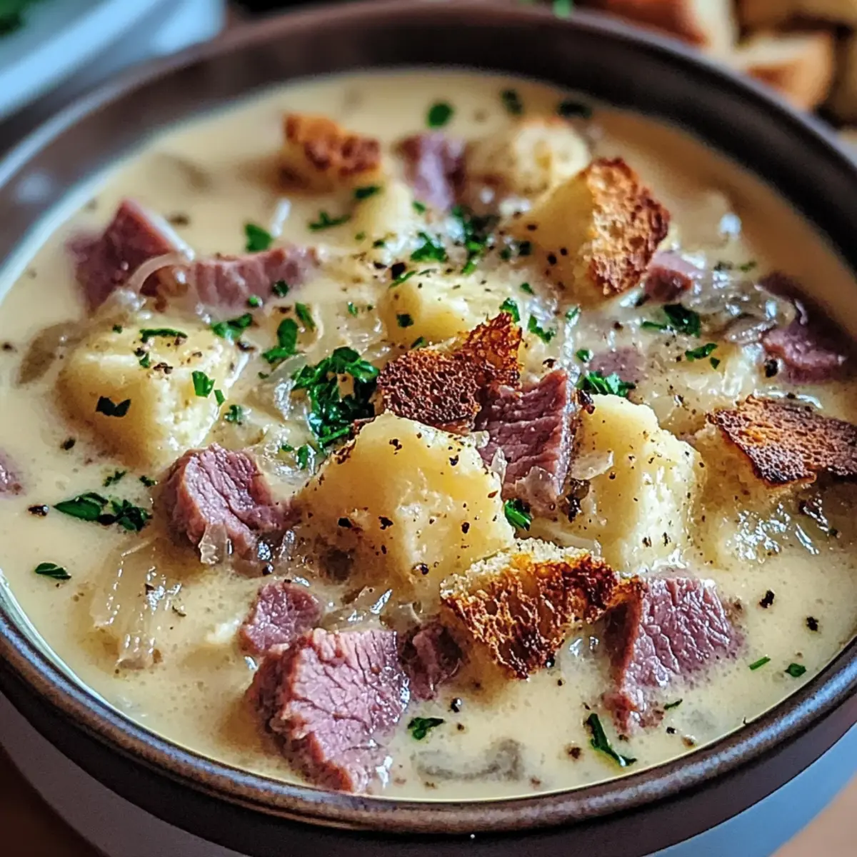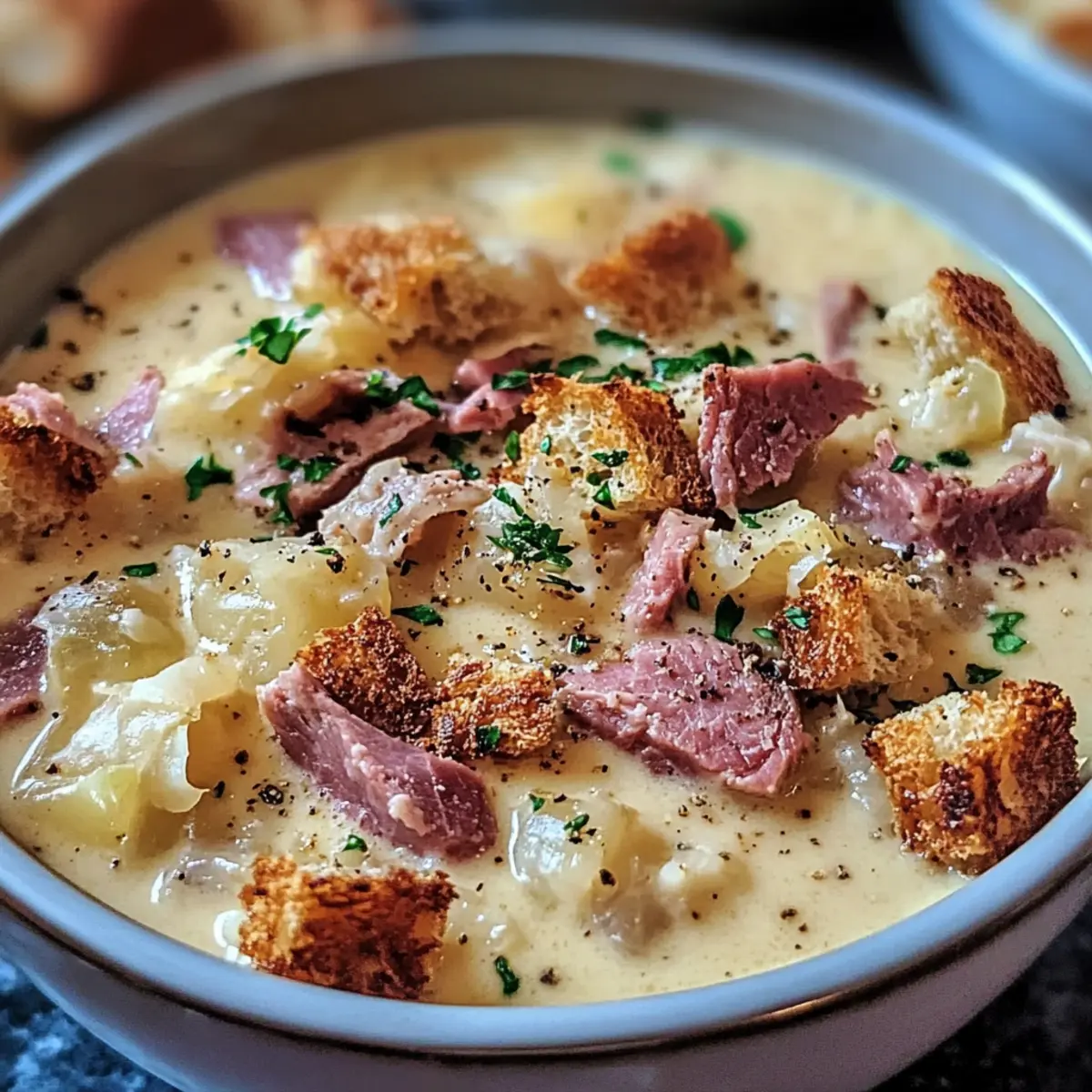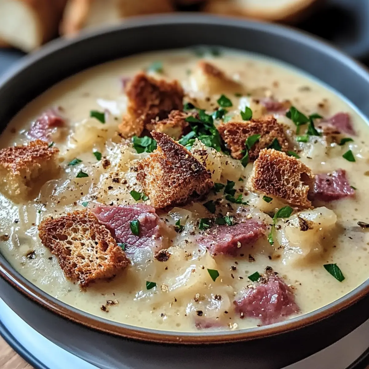 Serviere die Cremige Reuben-Suppe heiß in Tieftellern und garniere sie mit selbstgemachten Roggenbrot-Croutons und frisch gehackter Petersilie. Die Garnitur sorgt für eine wunderbare Textur und ergänzt die reichhaltigen Aromen der Suppe perfekt.