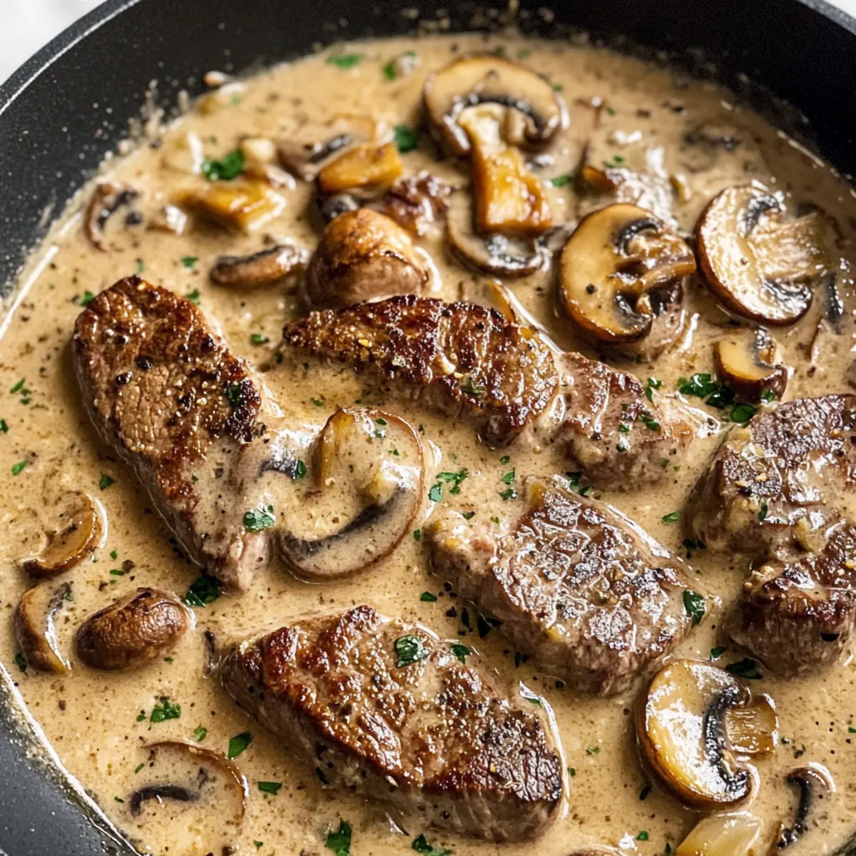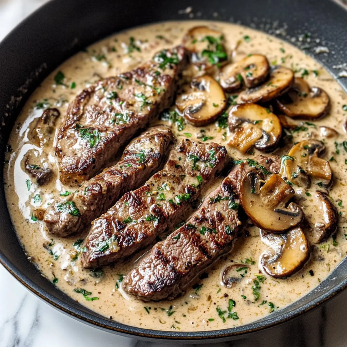 Das angebratene Steak wieder in die Pfanne geben und vorsichtig umrühren, um alles gut zu vermischen. Lass das Gericht für ca. 2-3 Minuten auf niedriger Hitze durchwärmen. Zum Schluss mit frisch gehackter Petersilie garnieren und servieren. Die cremigen Aromen der Steak Marsala und Pilze werden deine Gäste beeindrucken!