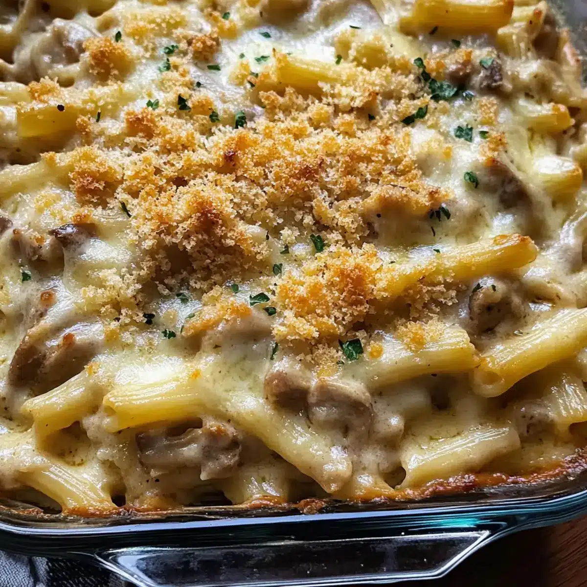 Bestreue die Oberfläche der Pasta mit geriebenem Käse, wie Parmesan oder Mozzarella, und streue dann die Panko-Brösel gleichmäßig darüber. Diese knusprige Kruste wird beim Backen schön braun und sorgt für einen köstlichen Kontrast zur cremigen Füllung.