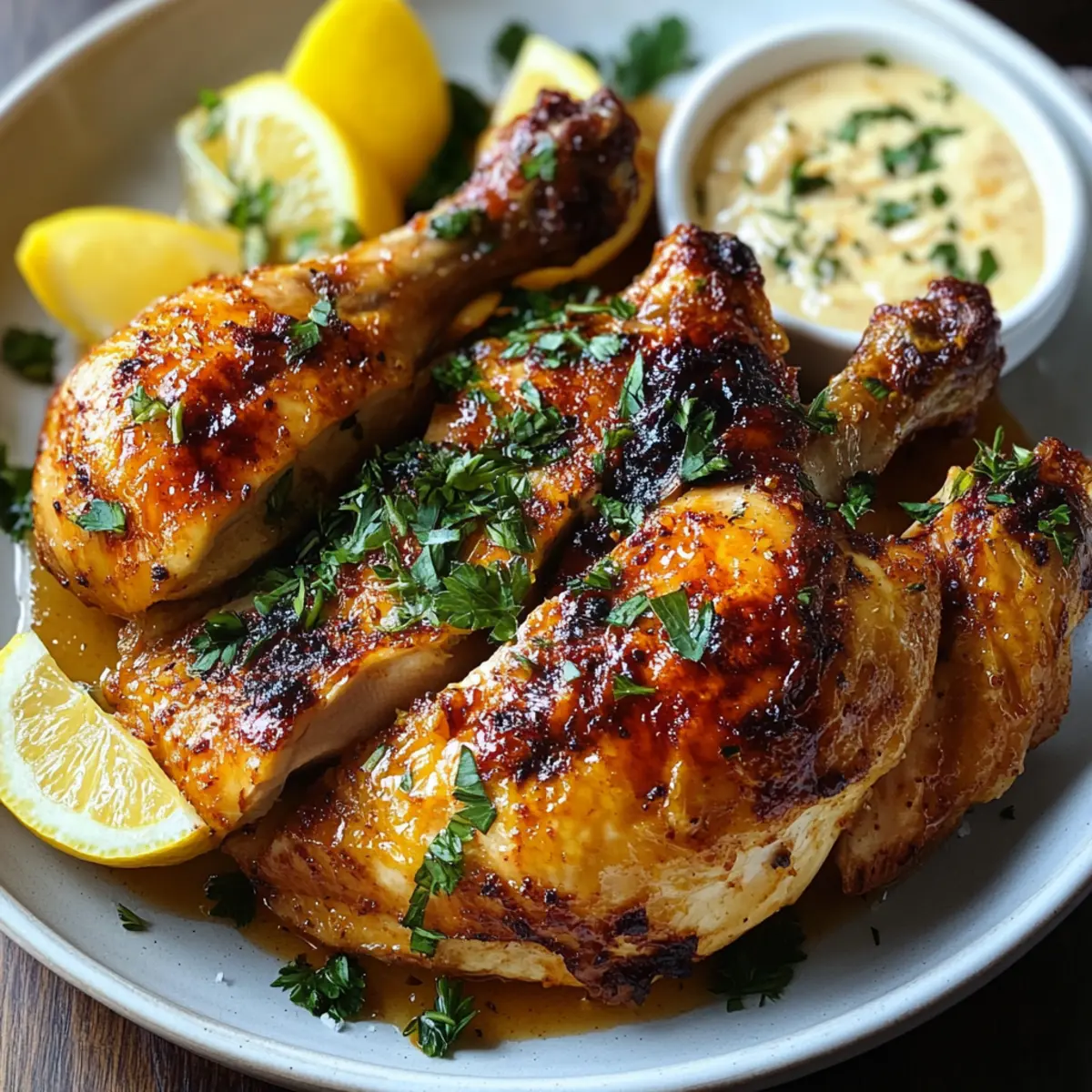 - Serviere das Hähnchen auf einem großen Holzbrett, umgeben von frischen Zitronenspalten und einer Knoblauchsoße.