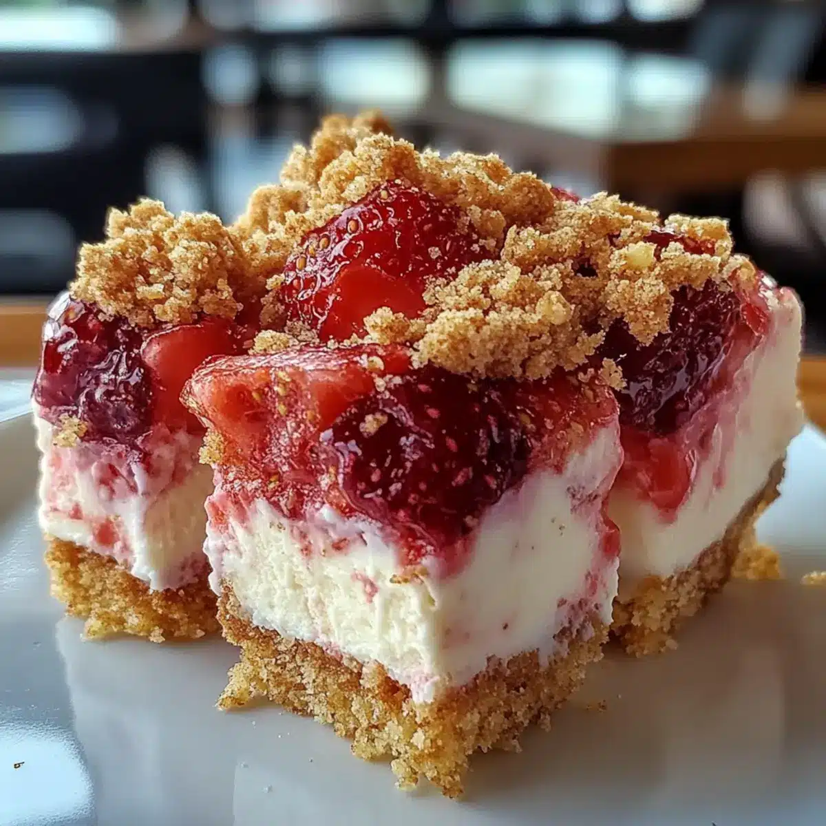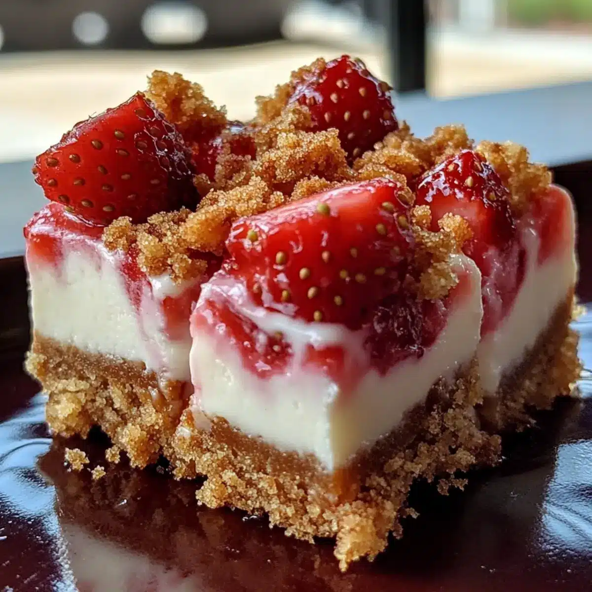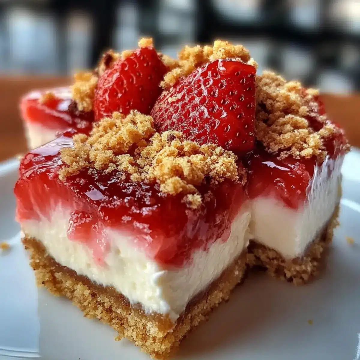 Schneide die Erdbeer-Crunch-Käsekuchen-Bissen mit einem scharfen Messer in kleine Quadrate. Reinige die Klinge zwischen den Schnitten, um saubere Kanten zu erhalten. Serviere die leckeren Bissen kalt und genieße die fruchtige Erfrischung!
