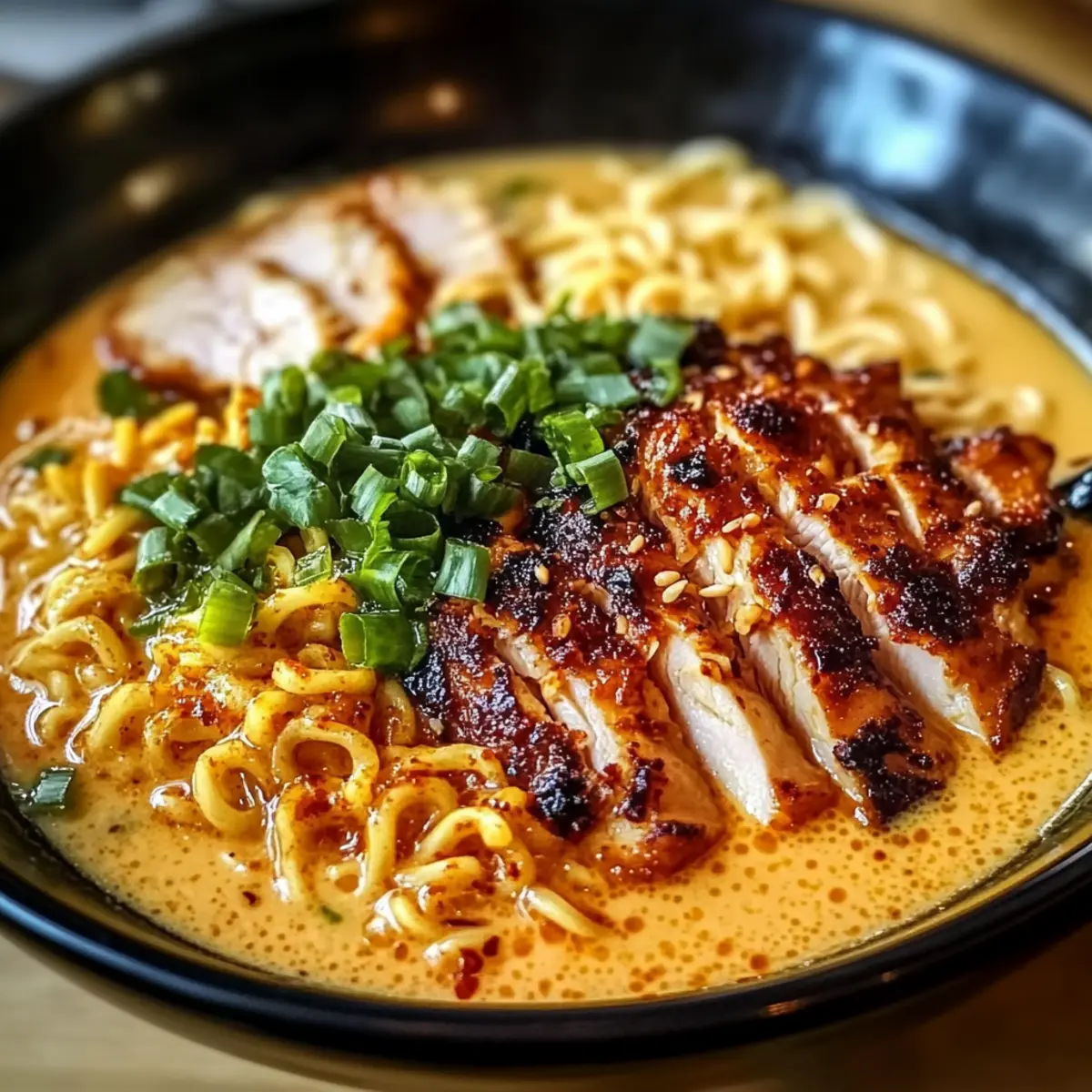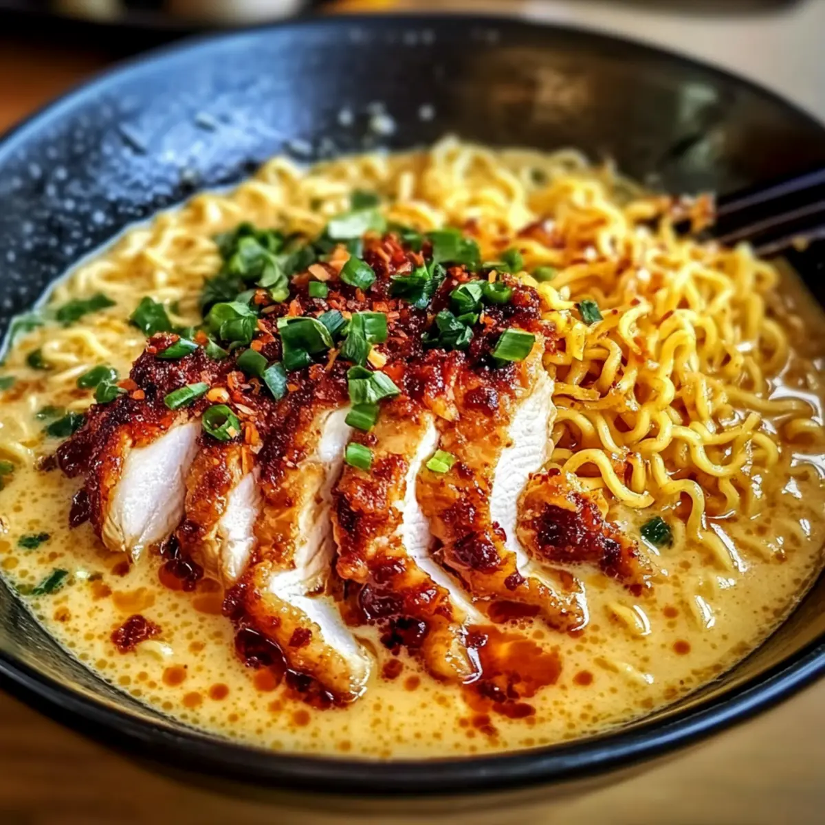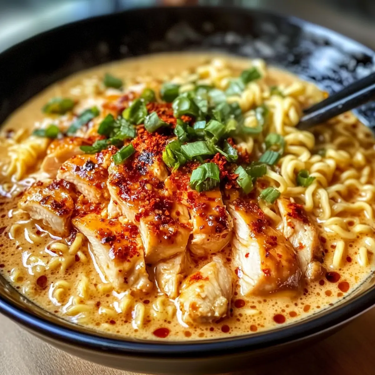 Feurige Hähnchenramen mit cremiger Knoblauchsoße