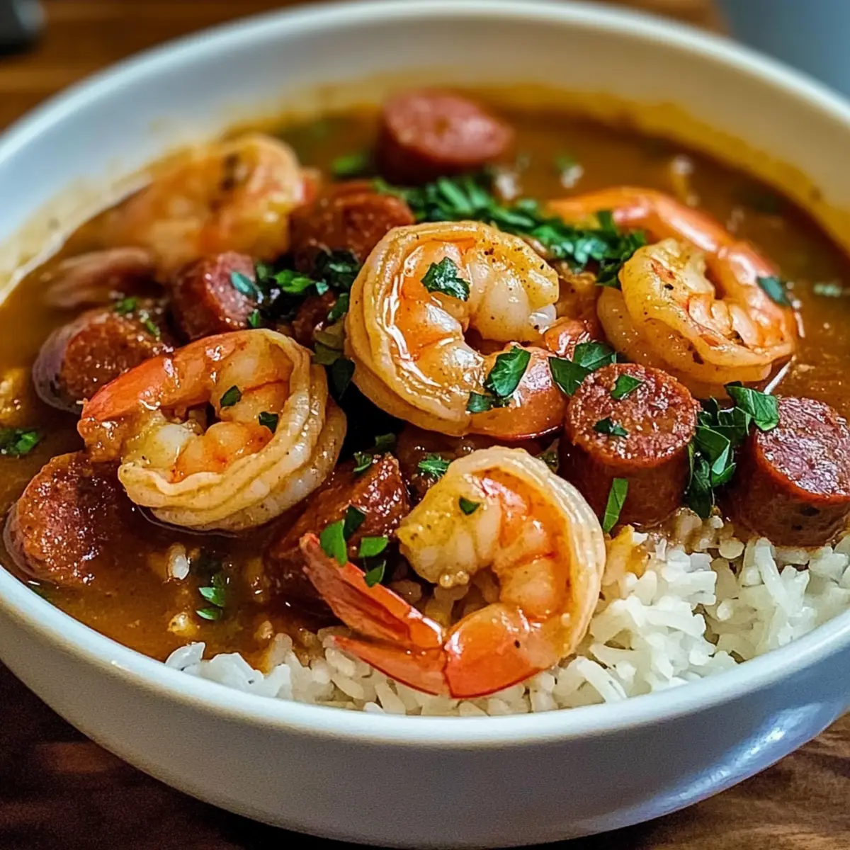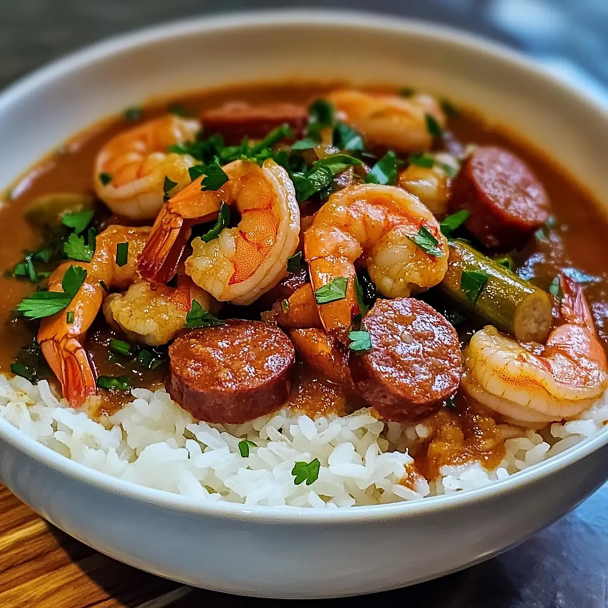 • Entdecke die köstlichen Zutaten für dein Garnelen- und Wurst-Gumbo, das die Seele der Cajun-Küche widerspiegelt!