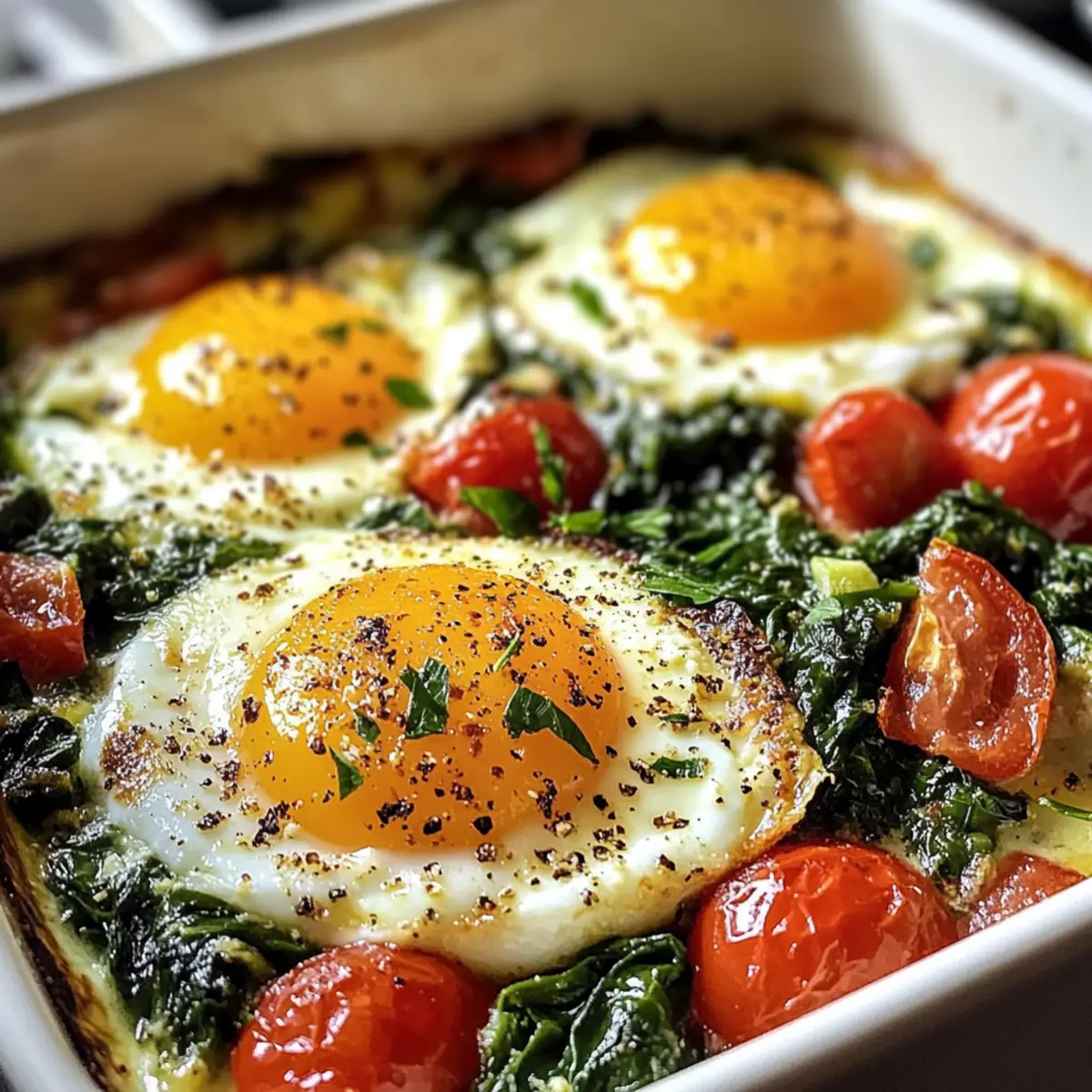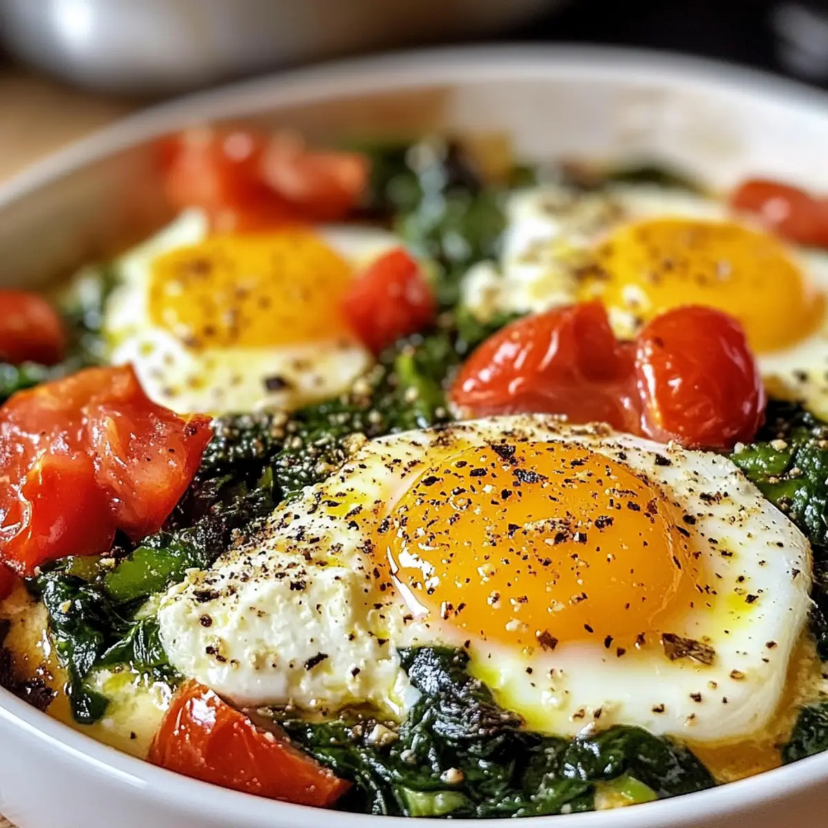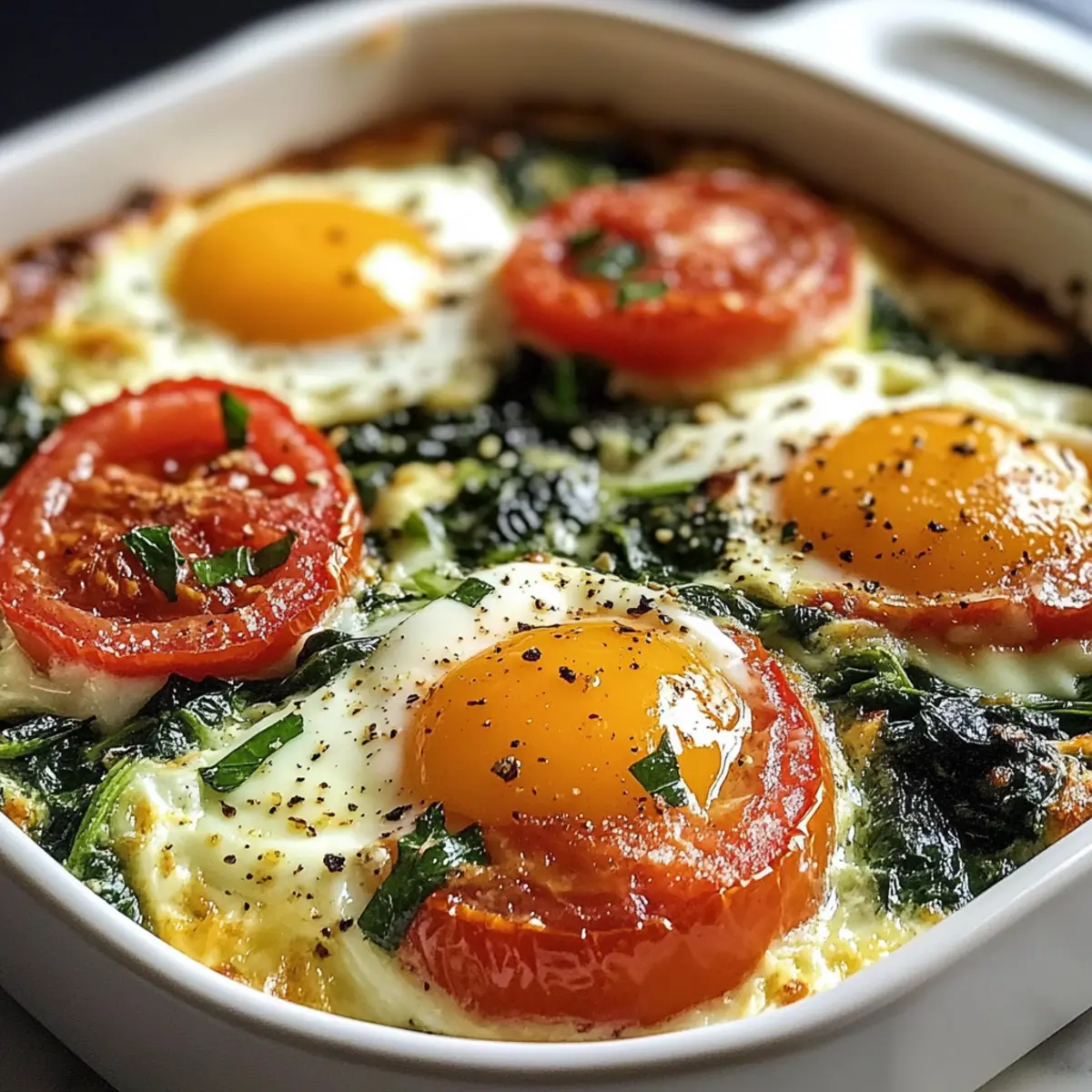 Schlage vorsichtig die Eier direkt über der Spinat-Tomaten-Mischung in der Backform auf. Achte darauf, genügend Platz zwischen den Eiern zu lassen, damit sie gleichmäßig garen können. Die Eier verleihen dem Gericht eine wunderbare Textur und machen es zu einem nahrhaften Frühstück.