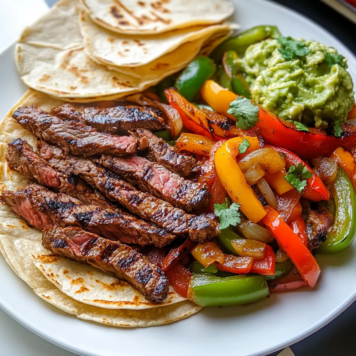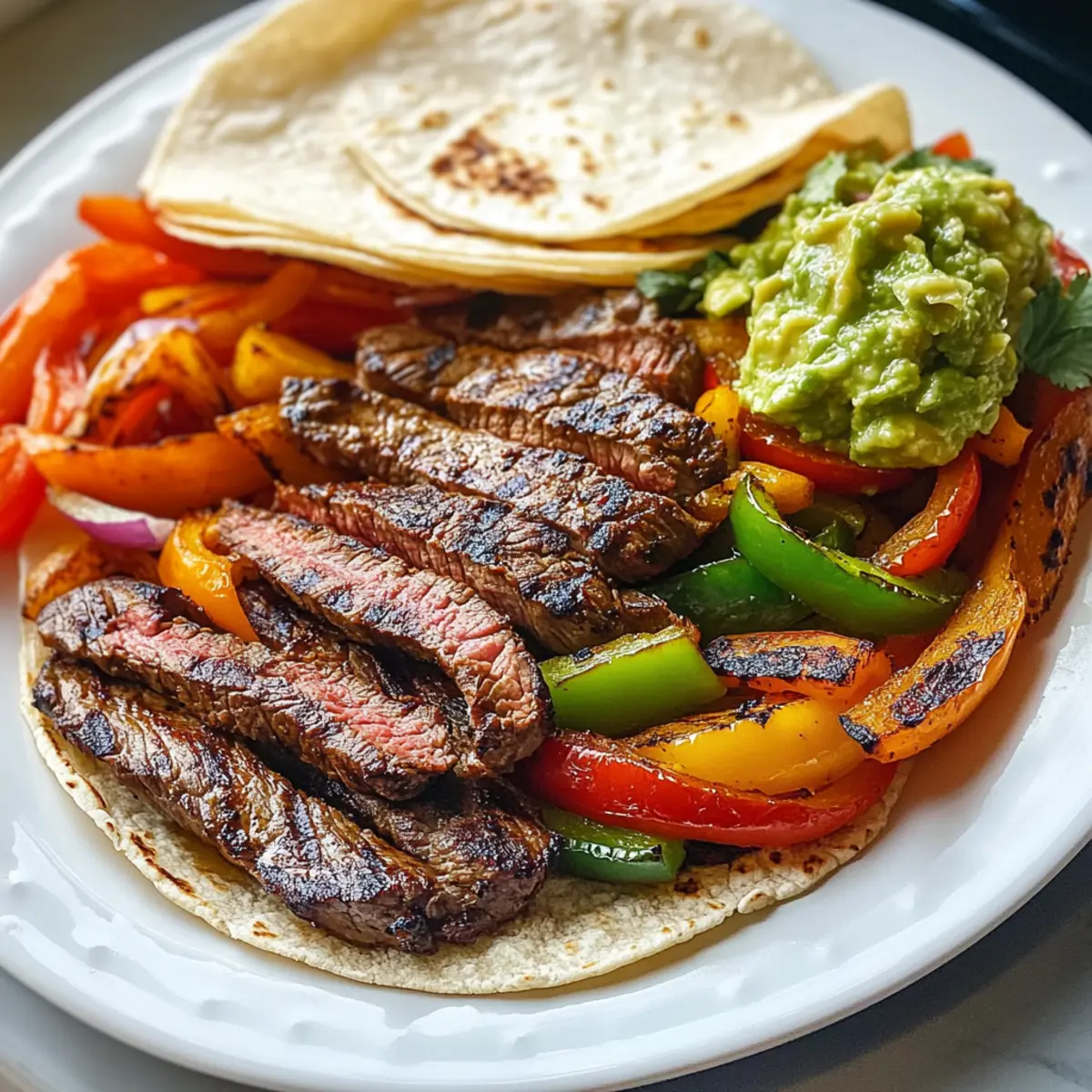 - Platte anrichten: Steak schneiden, Gemüse hinzufügen und Tortillas sowie Beilagen separat anrichten.