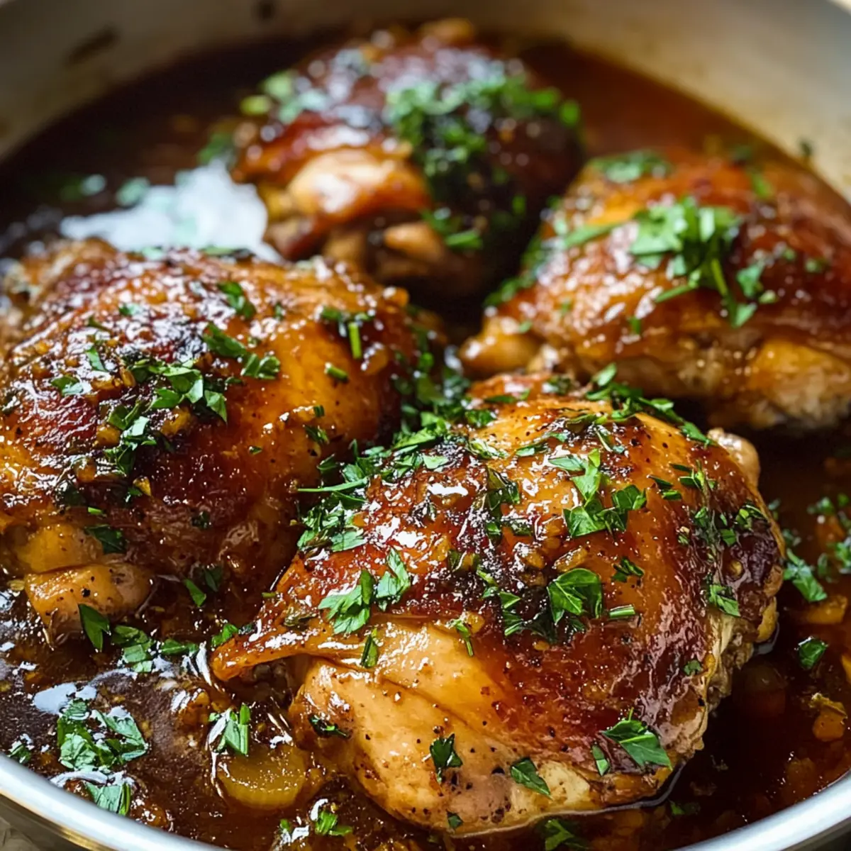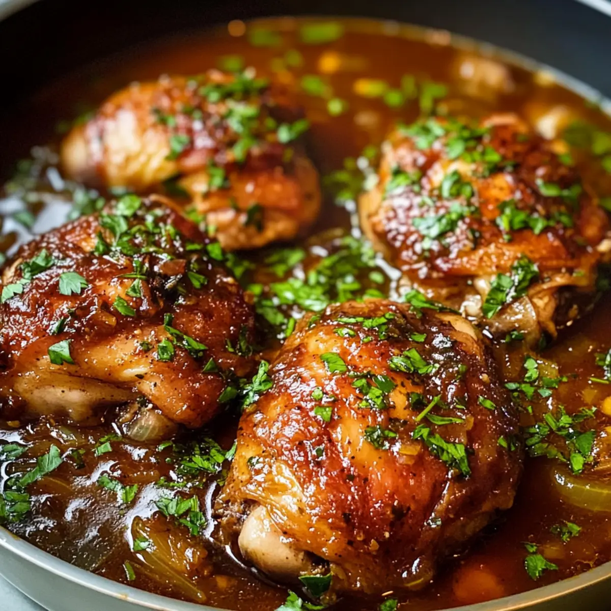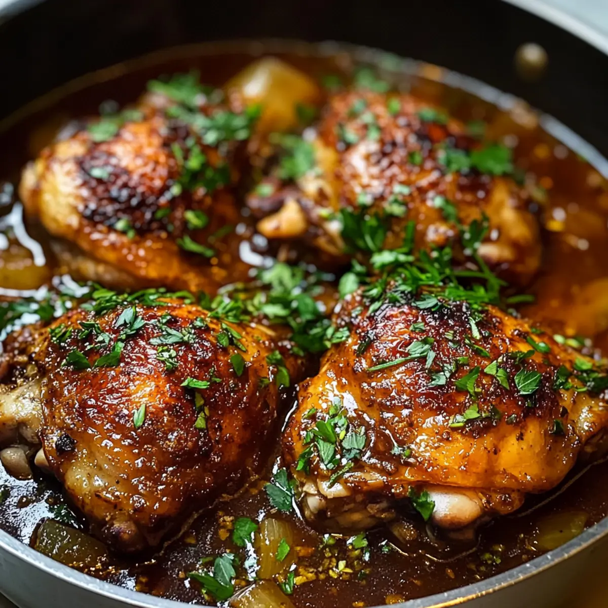 Gießt die Hälfte der vorbereiteten Sauce in den Schmortopf und legt die angebratenen Hühnchenschenkel mit der Hautseite nach oben zurück. Gießt die restliche Sauce gleichmäßig über das Huhn, damit es beim Garen gleichmäßig mit den köstlichen Aromen durchzogen wird. Diese Schritte sind entscheidend, um der Sauce und dem Hühnchen einen reichen Geschmack zu verleihen.