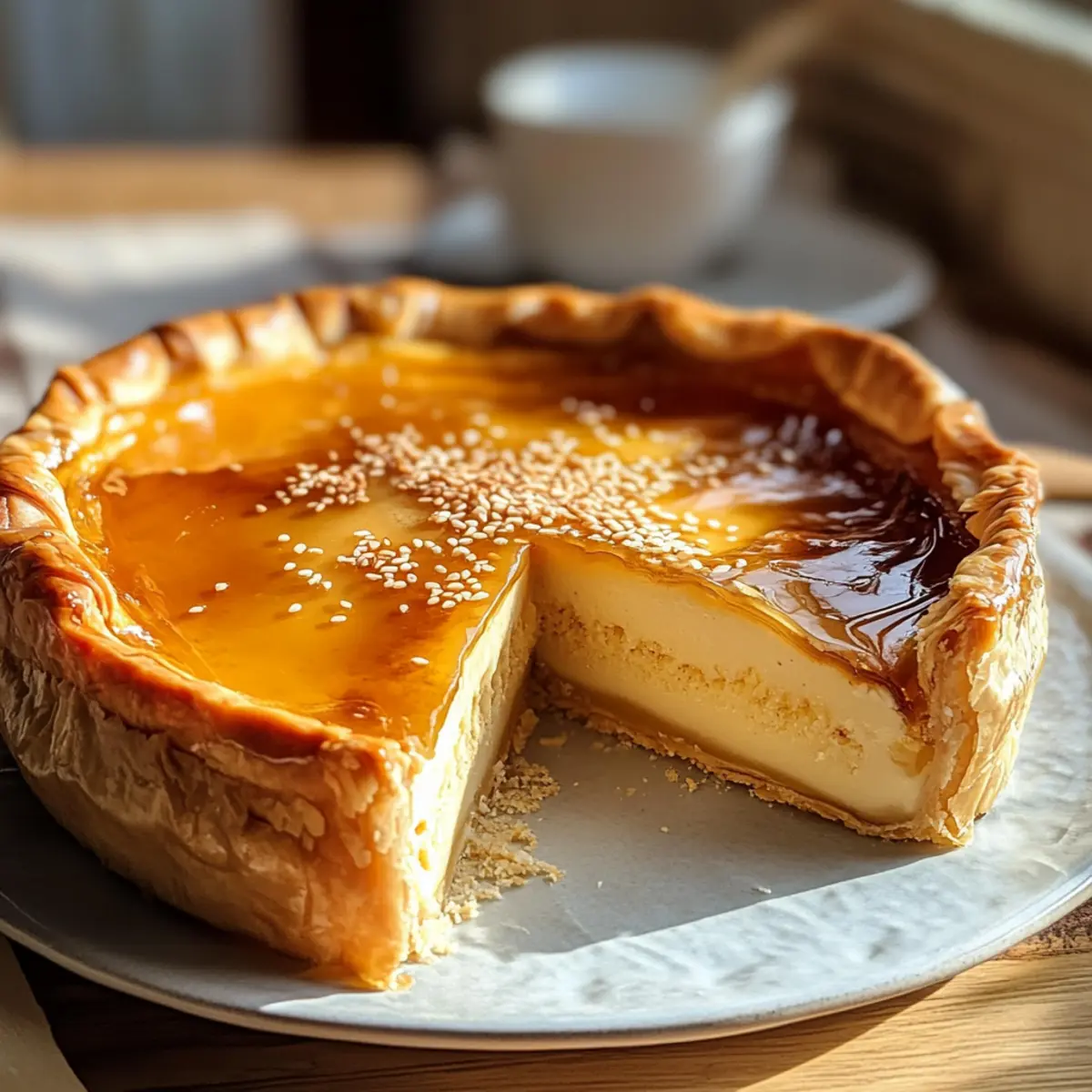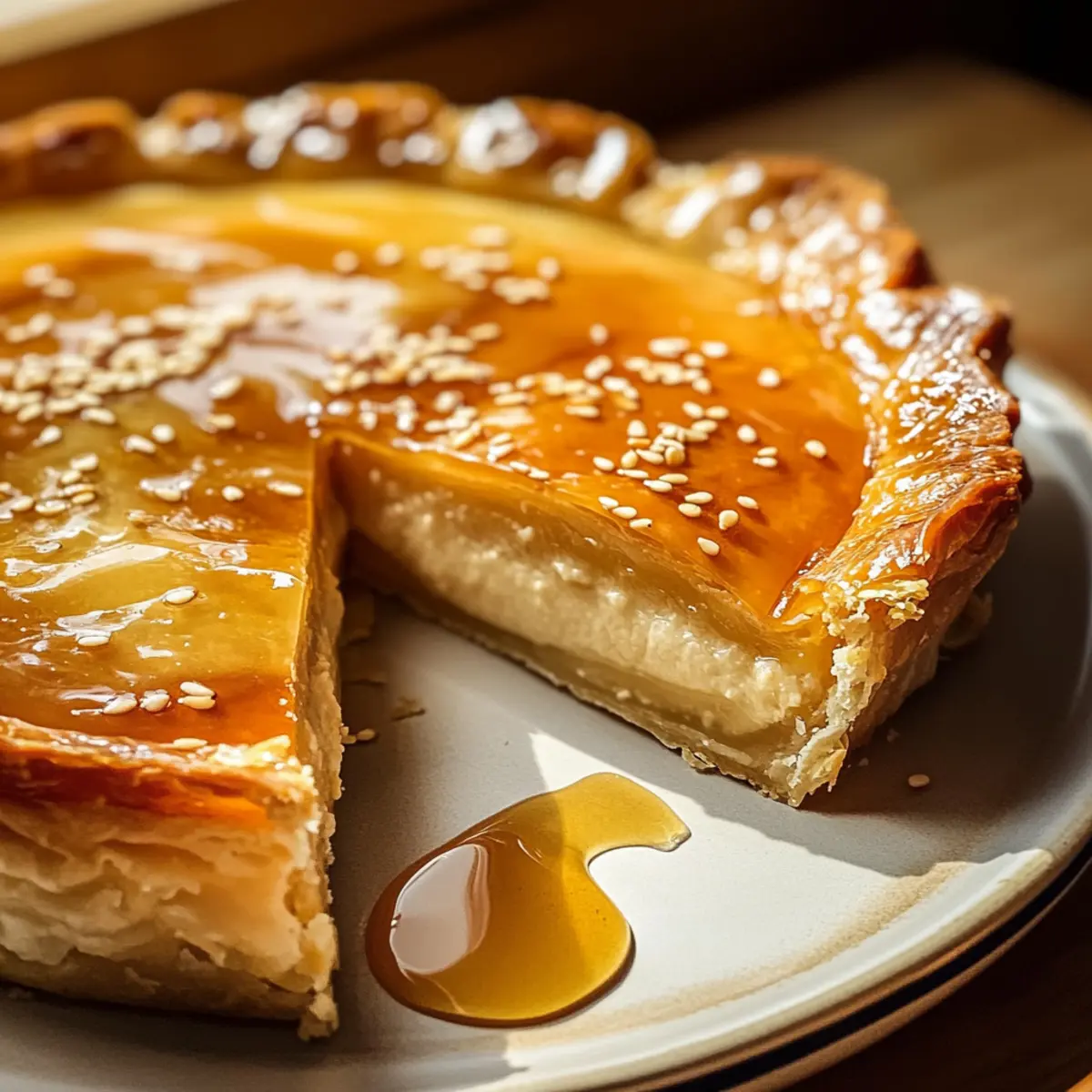- Lass die Torte 10 Minuten abkühlen, bevor du sie mit dem erwärmten Honig beträufelst und die Sesamsamen darüber streust.