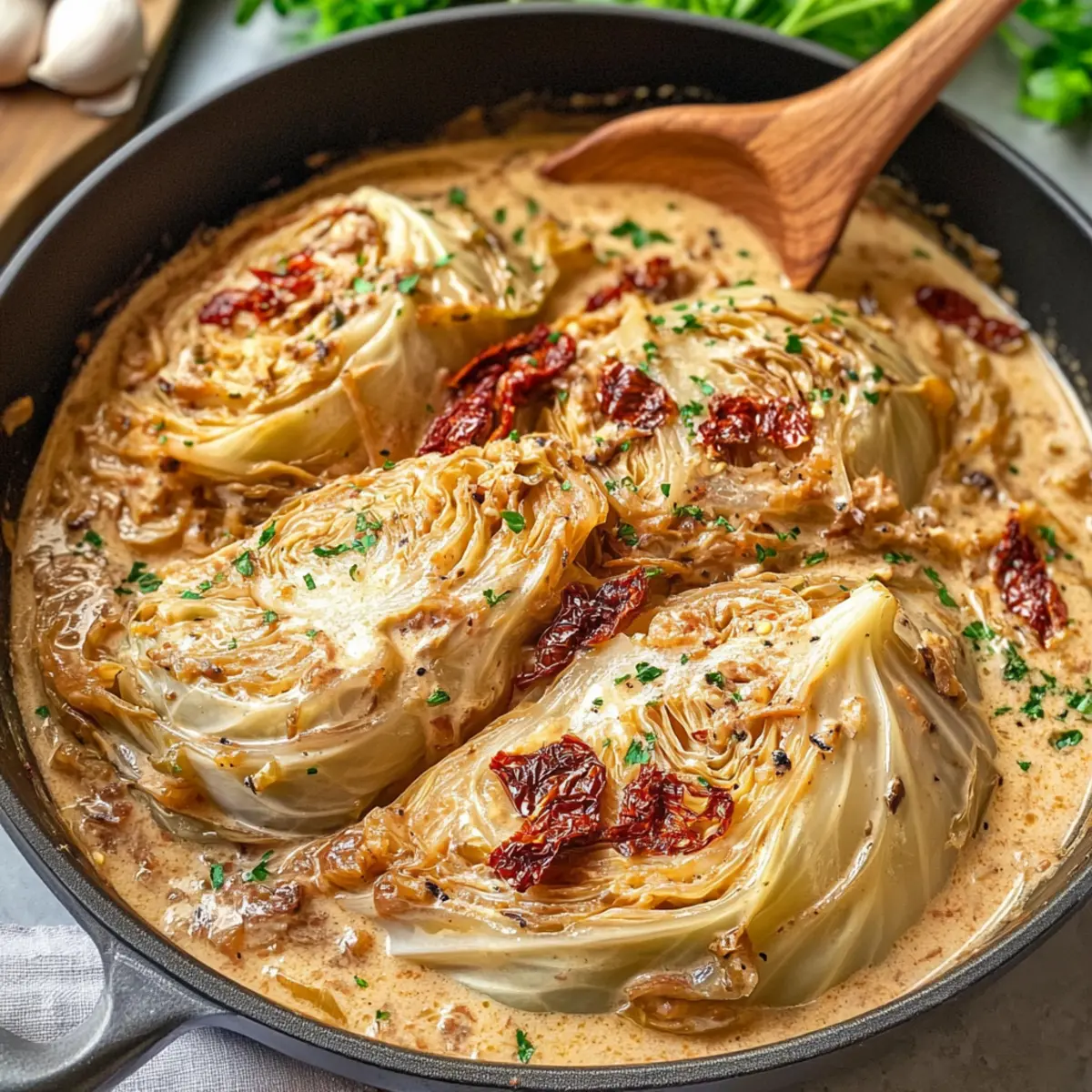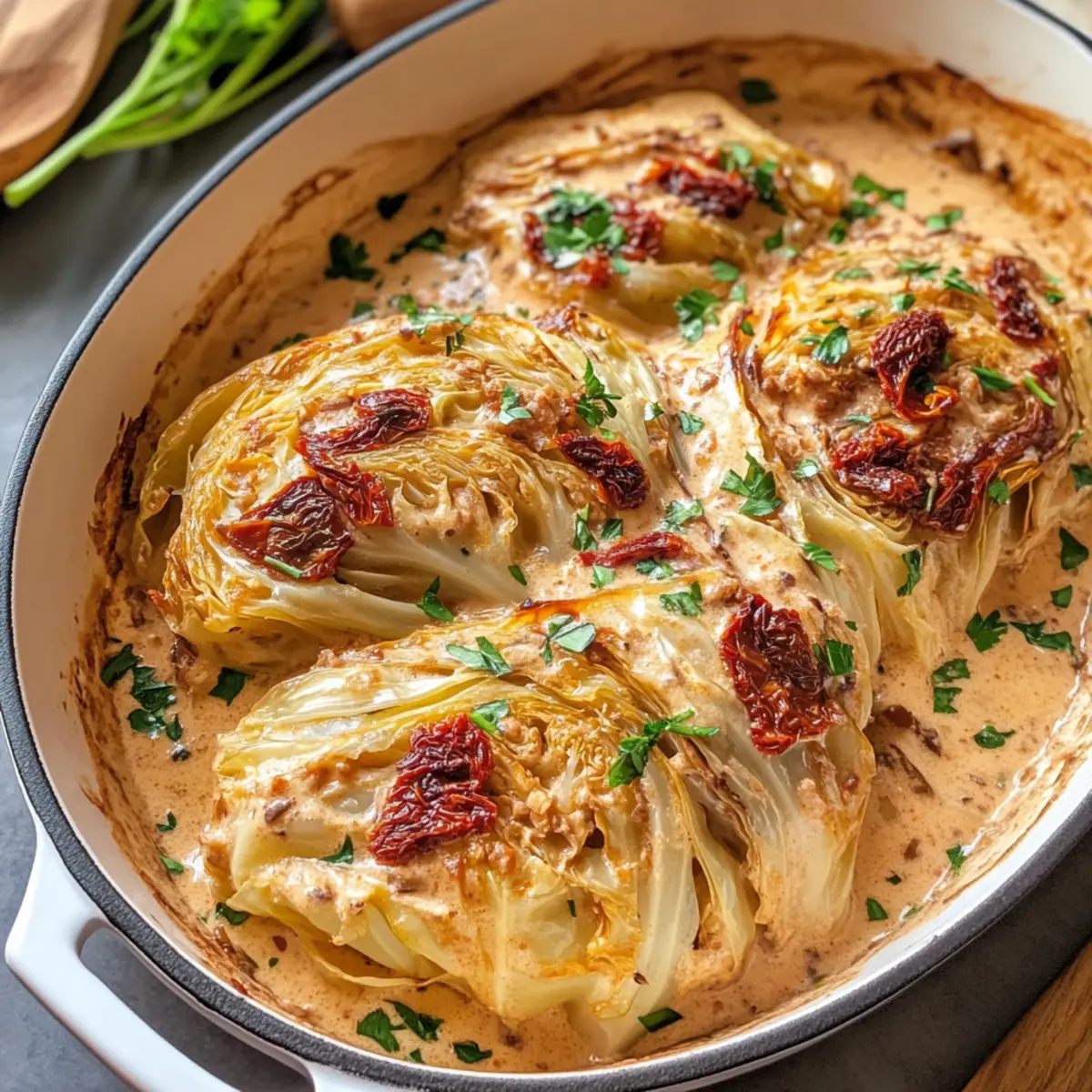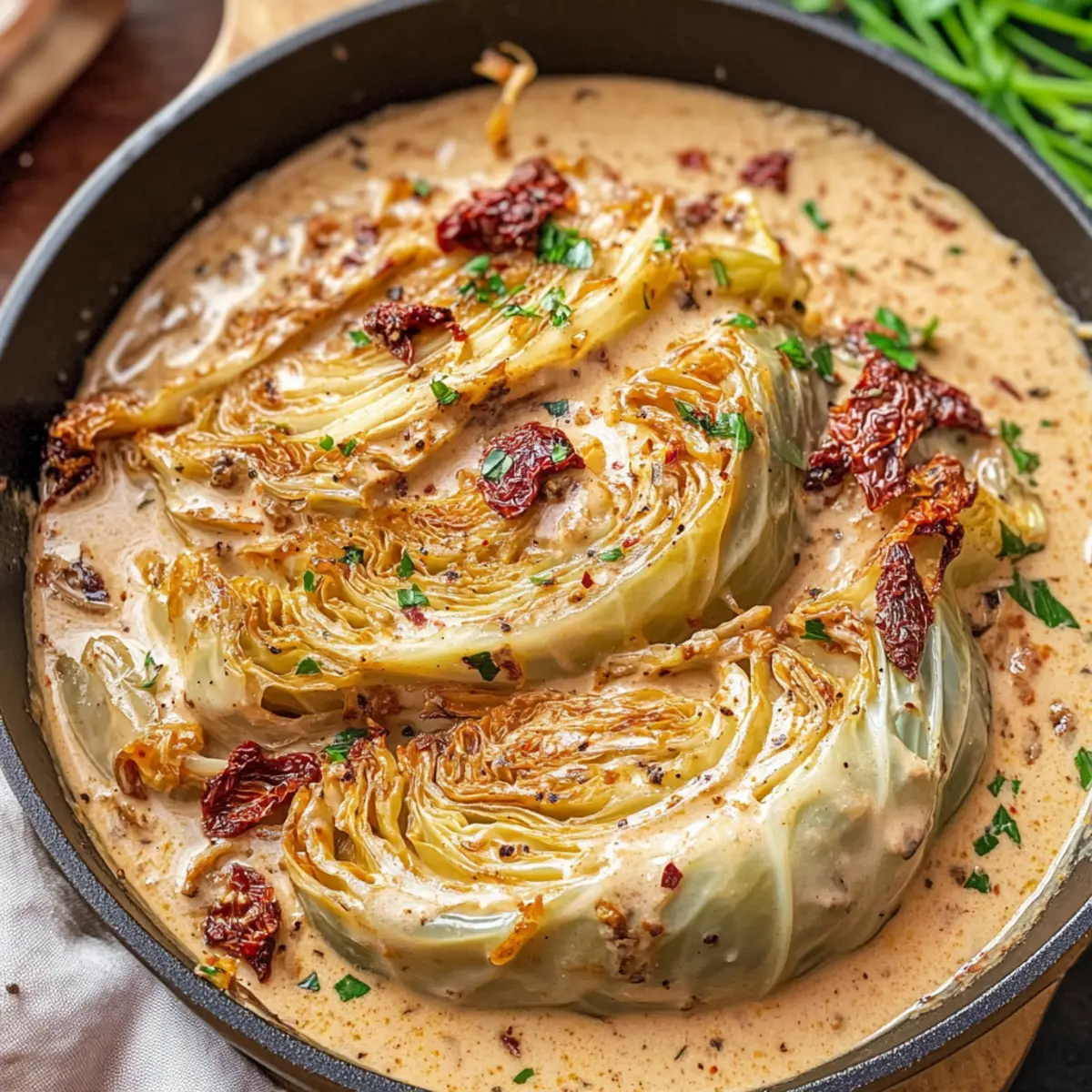 Köstlicher Geschmack: Die Kombination aus cremiger Sauce, aromatischen Kräutern und zartem, geschmolzenem Kohl bringt ein wahres Geschmackserlebnis auf den Tisch.
