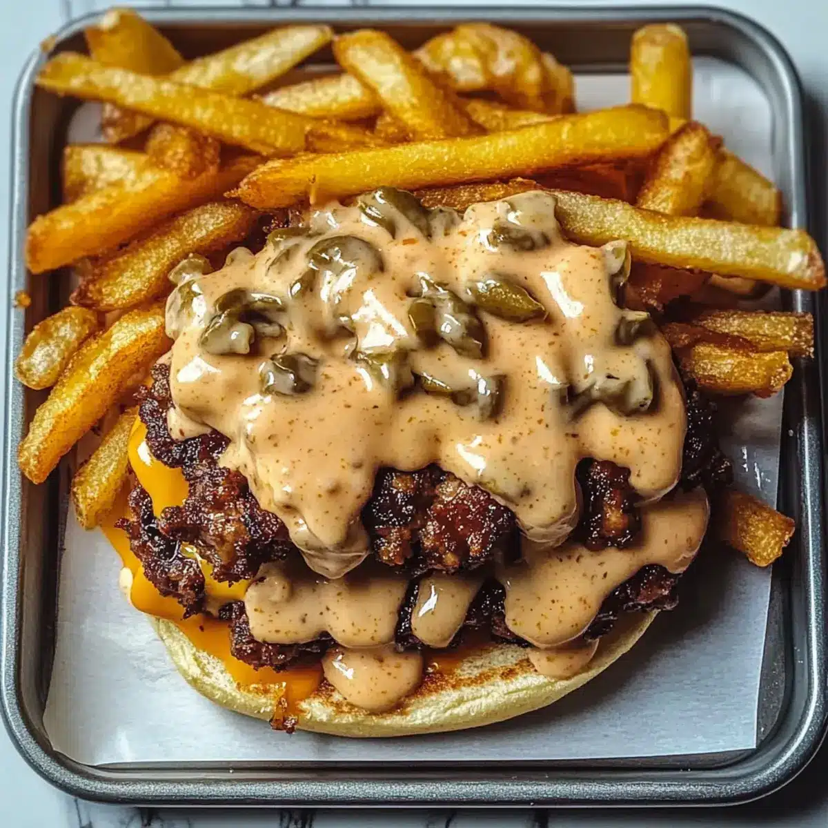 Nehme die Pommes aus dem Ofen und träufle das Thousand Island Dressing darüber. Du kannst nach Belieben auch zusätzliche Toppings wie Gurken oder Jalapeños hinzufügen, um den Geschmack deiner Herzhafte Smash Burger Pommes zu verfeinern. Serviere das Gericht warm und genieße die Kombination aus knusprigen und cremigen Texturen!