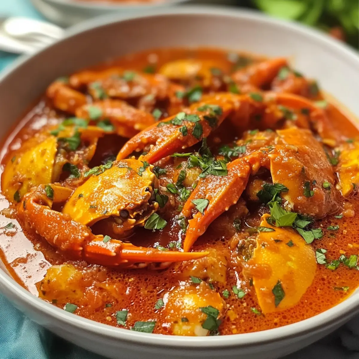 Falte vorsichtig die vorbereiteten Krabbenstücke in die köchelnde Sauce. Stelle sicher, dass alle Krabben gut mit der Sauce bedeckt sind. Lass sie nun für 15–20 Minuten im Topf garen, bis sie zart und durchgegart sind. Die Krabben sollten eine lebendige Farbe annehmen und zart sein.
