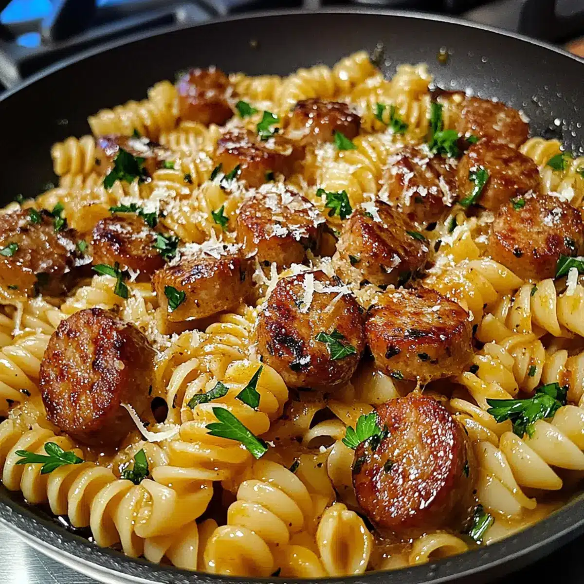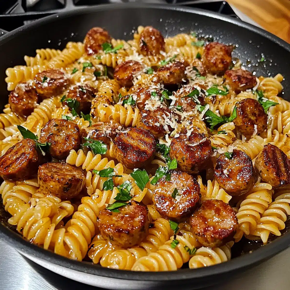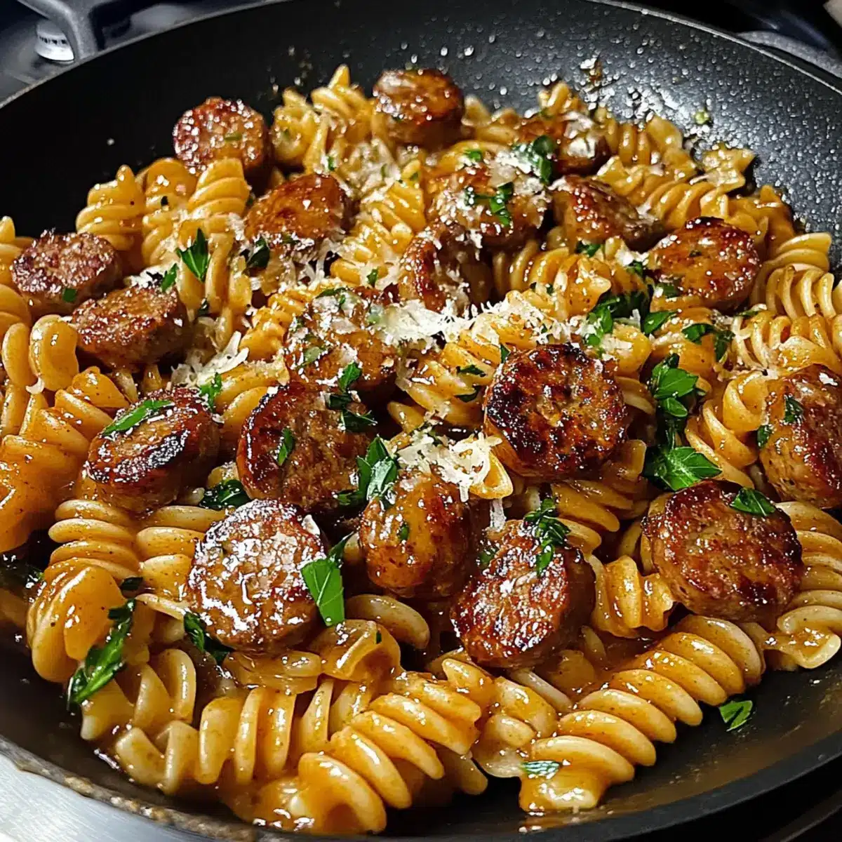 Schmecke die Honig Knoblauch Wurst Pasta Pfanne mit Salz und Pfeffer ab. Garniere das Gericht mit frischer, gehackter Petersilie und, wenn gewünscht, etwas geriebenem Parmesan. Serviere die Pasta sofort und genieße das köstliche Geschmackserlebnis!