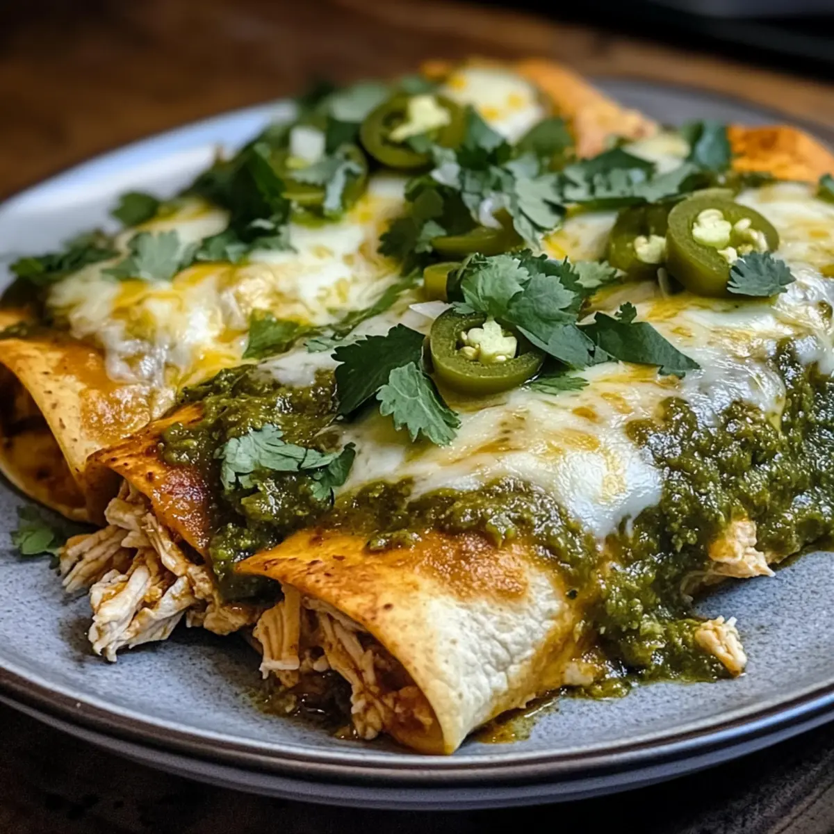 Nehmt die Enchiladas aus dem Ofen und lasst sie etwa 5 Minuten ruhen, damit sich die Aromen setzen können. Diese Geschmeidigkeit sorgt dafür, dass die grüne Sauce und der Käse schön miteinander verschmelzen. Serviert die Hühnchen-Enchiladas mit zusätzlichem Koriander oder einem Spritzer Limettensaft, um das Gericht frisch zu ergänzen.