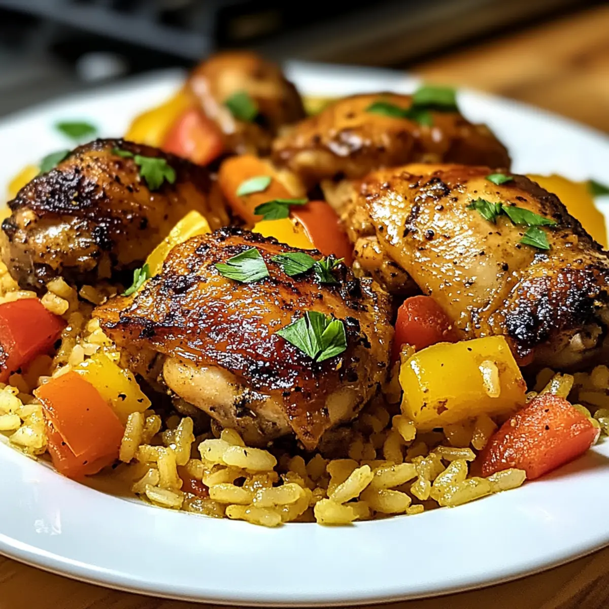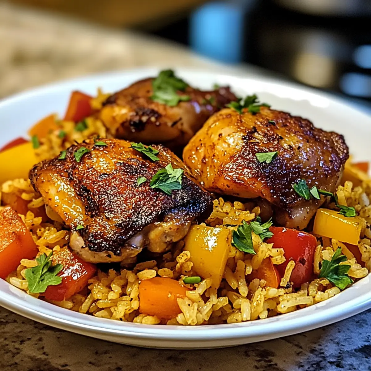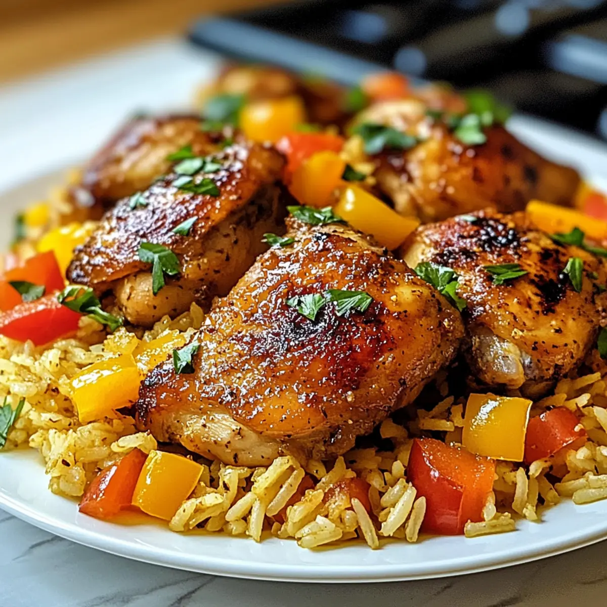 Gieße die Hühnerbrühe in die Pfanne und kratz die angebratenen Reste vom Pfannenboden ab, um zusätzlichen Geschmack zu erhalten. Lege die angebratenen Hähnchenschenkel auf den Reis, decke die Pfanne ab und reduziere die Hitze. Lasse das Ganze etwa 20-25 Minuten köcheln, bis der Reis zart und das Hähnchen durchgegart ist.
