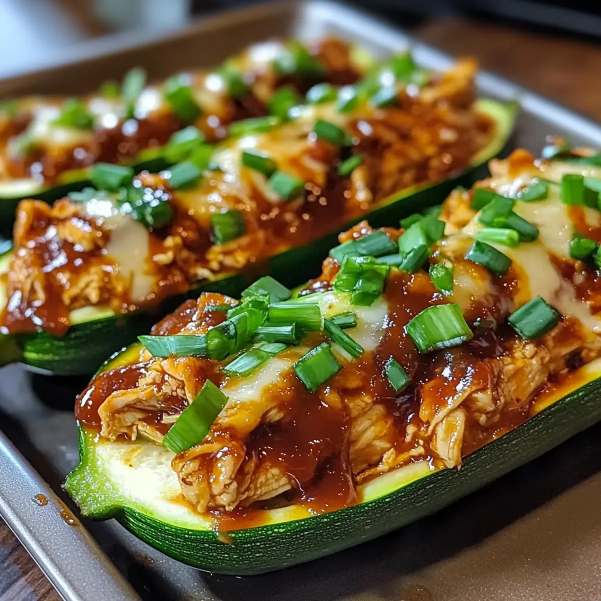 - Fülle die BBQ-Hähnchen-Mischung in die Zucchinihälften.