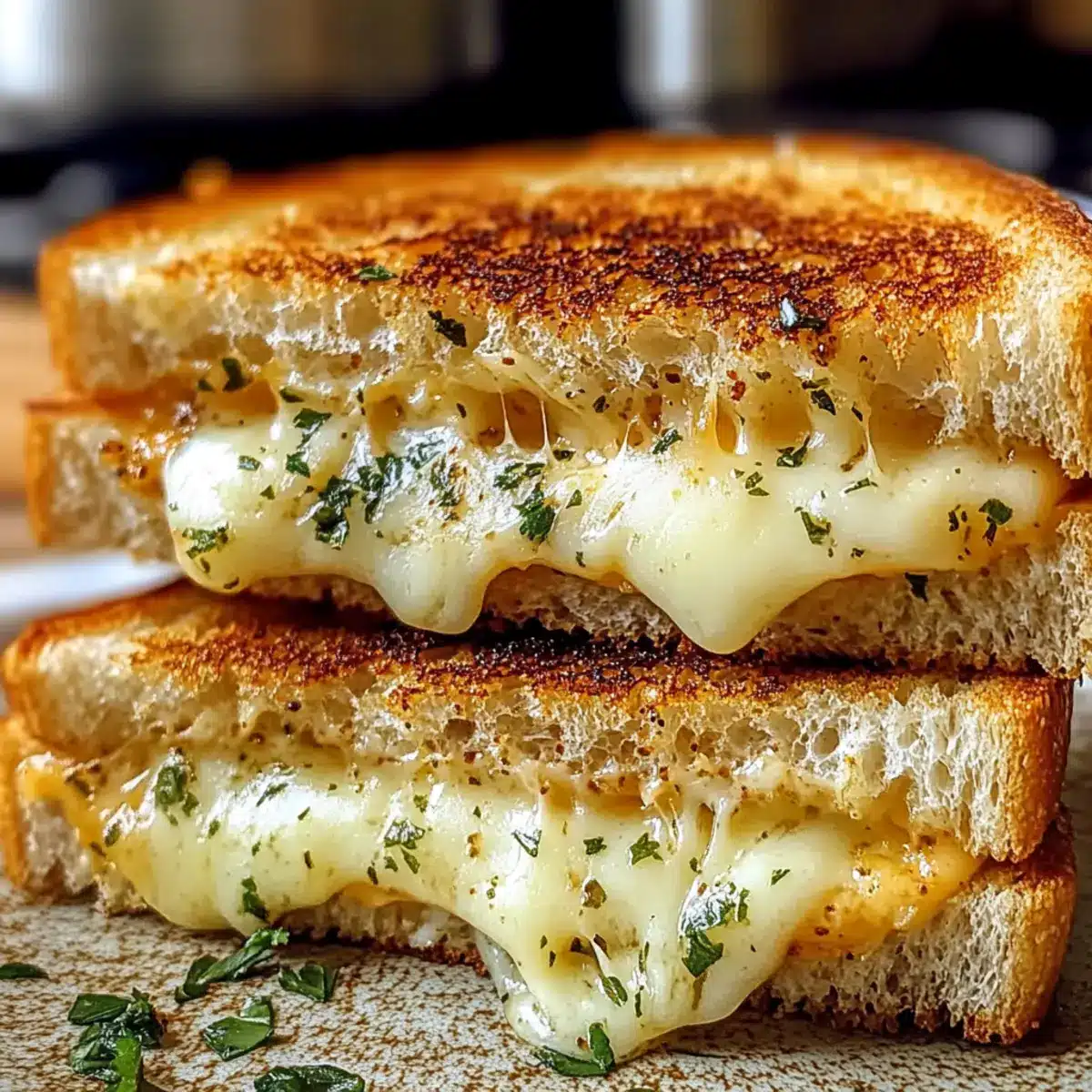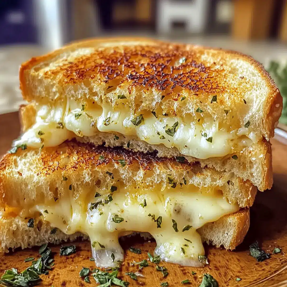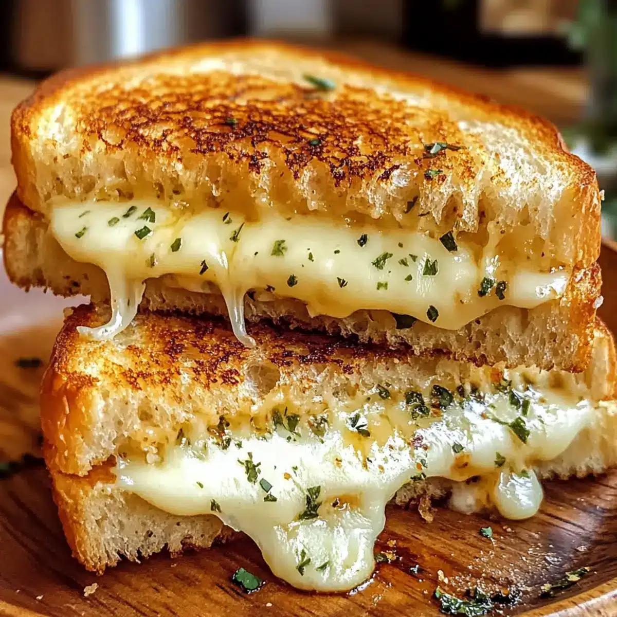 Sobald die Sandwiches fertig sind, nimm sie aus der Pfanne und lasse sie einige Minuten auf einem Gitter abkühlen, um die Knusprigkeit zu bewahren. Schneide sie diagonal in zwei Hälften und serviere sie sofort, damit du die gooey, schmelzende Käsemischung und die aromatische Knoblauchkruste bestmöglich genießen kannst.