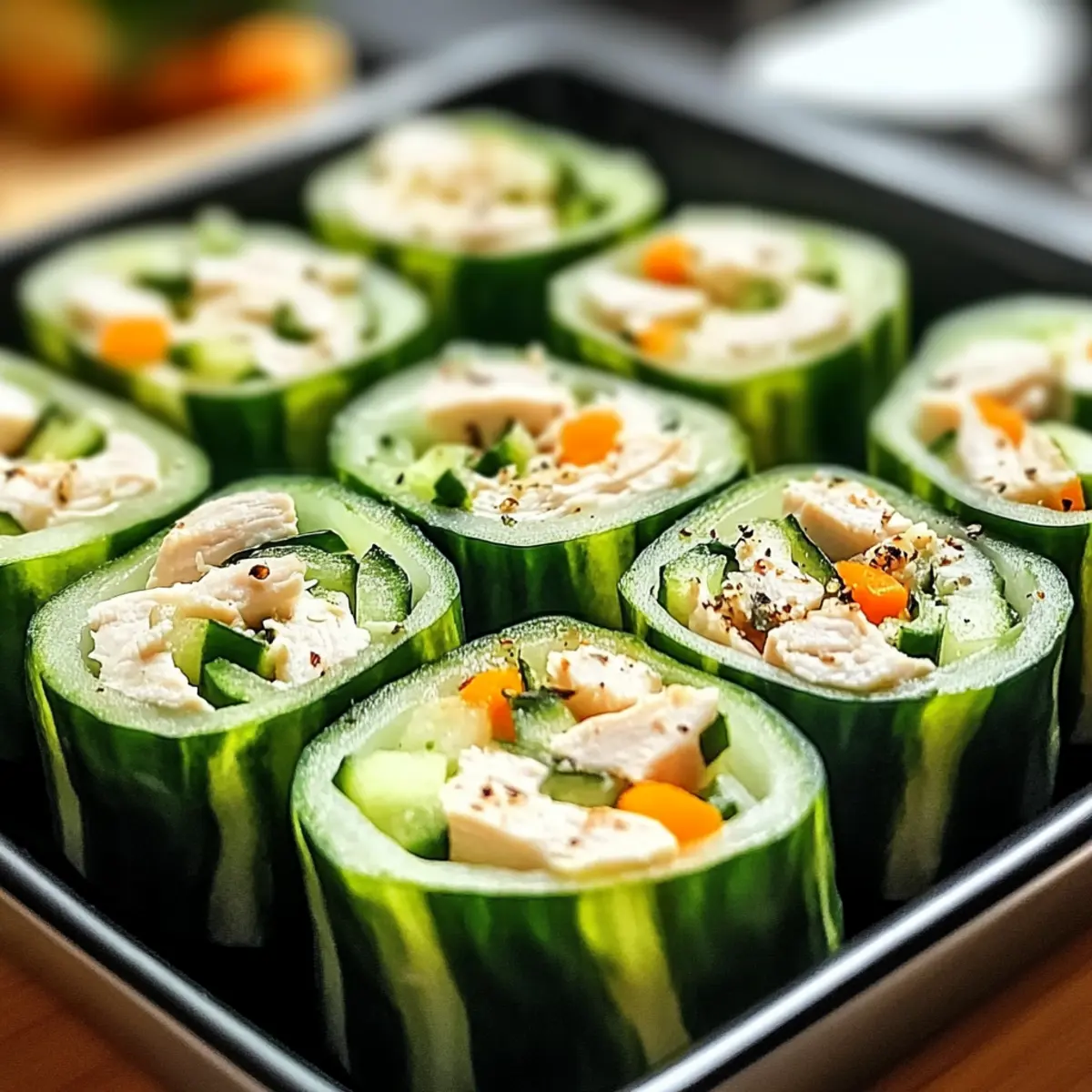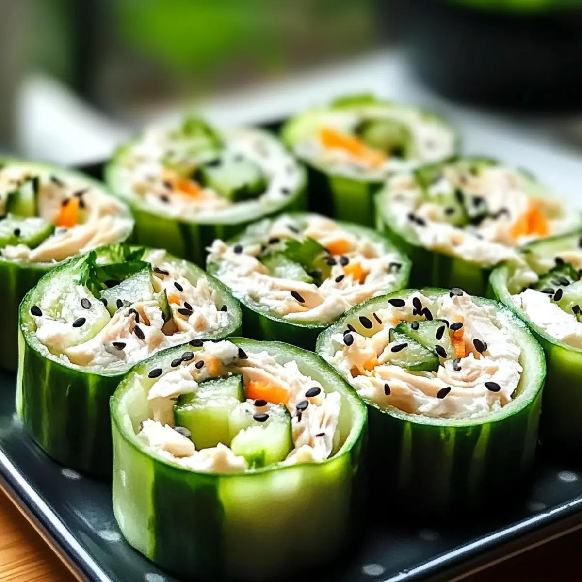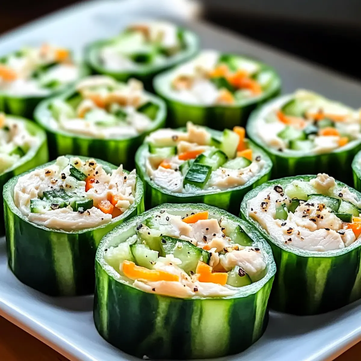 Arrangiere die Knuspriger Hähnchensalat Gurken-Röllchen auf einem großen Servierteller. Am besten werden sie frisch serviert, um die knackige Textur der Gurken zu genießen. Diese Röllchen sind eine perfekte gesunde Snack-Option, die du sofort mit Freunden und Familie teilen kannst.