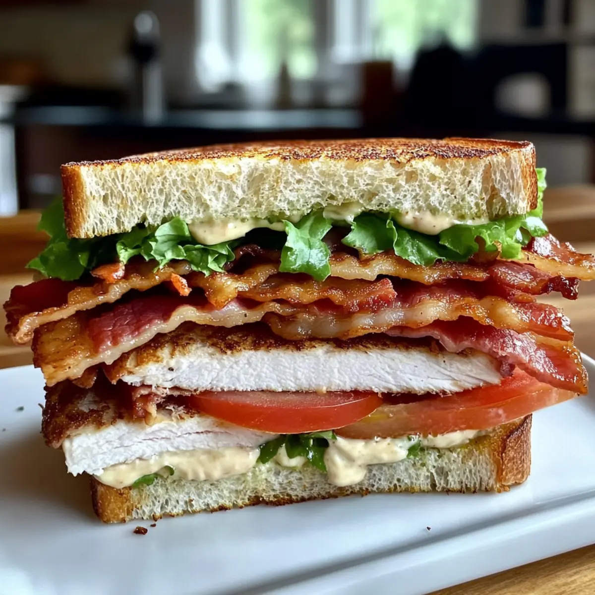 Beginne mit der untersten Brotscheibe, die mit einer großzügigen Schicht Mayonnaise bestrichen wird, um Feuchtigkeit und Geschmack hinzuzufügen. Füge dann eine Schicht frischen Romanasalat hinzu, gefolgt von dünnen Tomatenscheiben, knusprigem Bacon, einer Portion Truthahn oder Hähnchen und einem Käse deiner Wahl, um den Geschmack zu intensivieren.