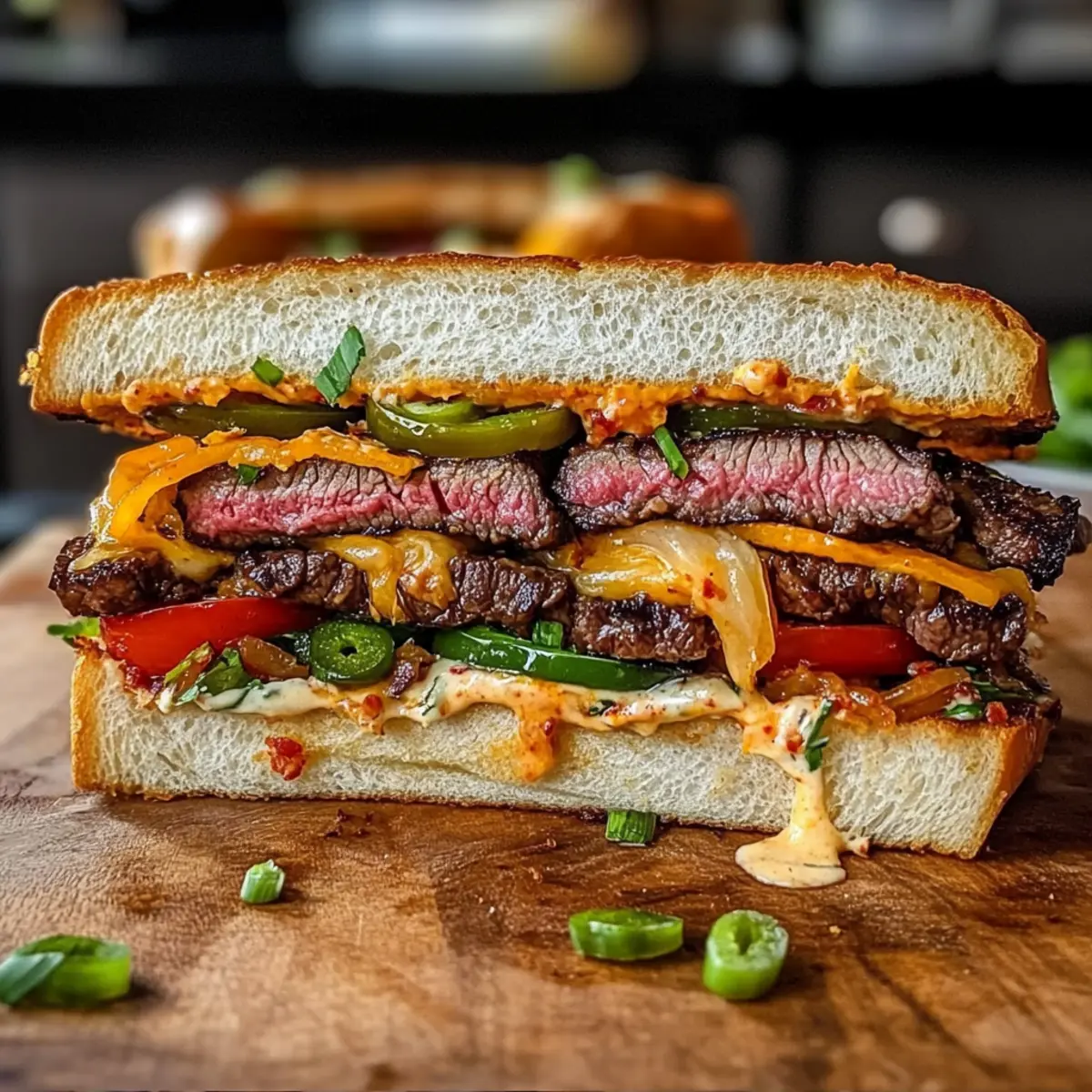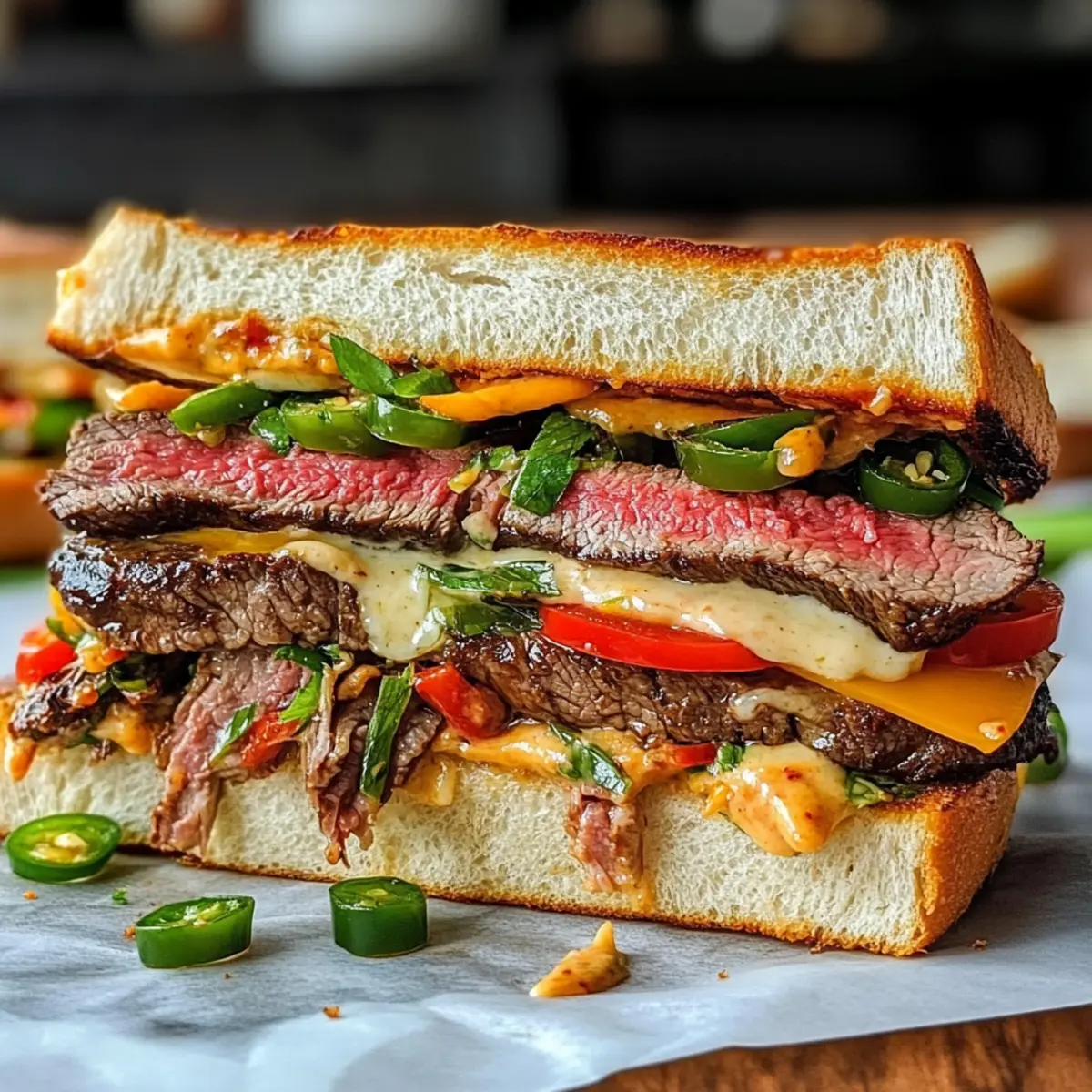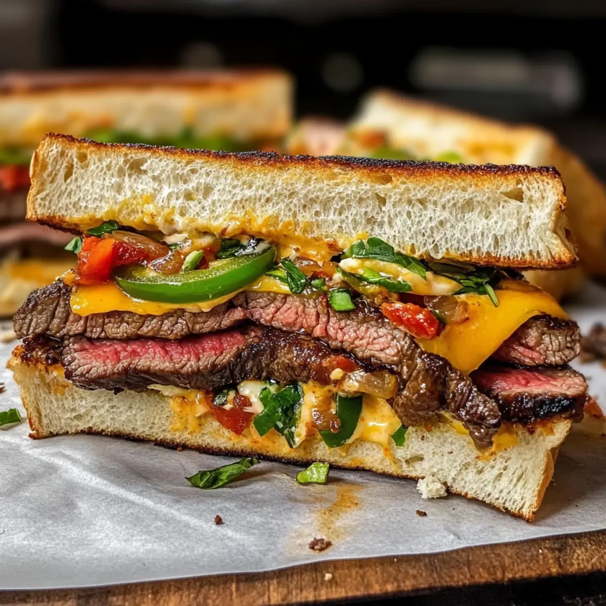 Bestreiche eine Seite jeder Brotscheibe mit Butter. Schichte die Sauté-Paprika, die gebratenen Steakstreifen, Sesamkörner, geriebenen Käse, rote Zwiebel, Jalapeños und Frühlingszwiebeln zwischen die Brotscheiben. Lege die unbutterte Seite nach außen, um die perfekte goldene Kruste zu gewährleisten.