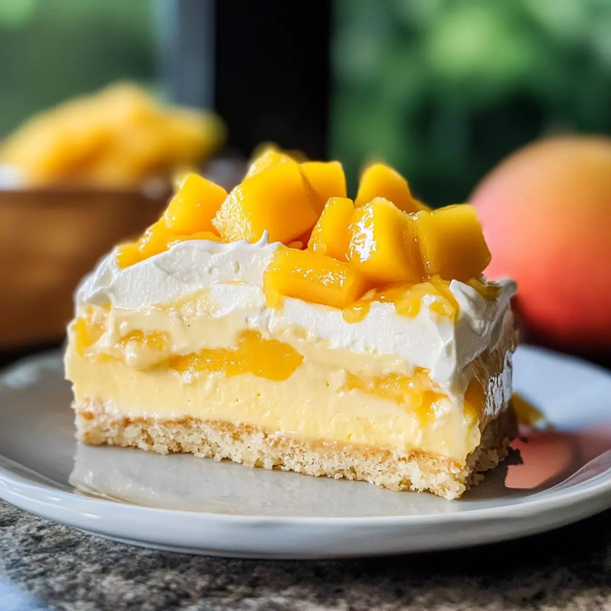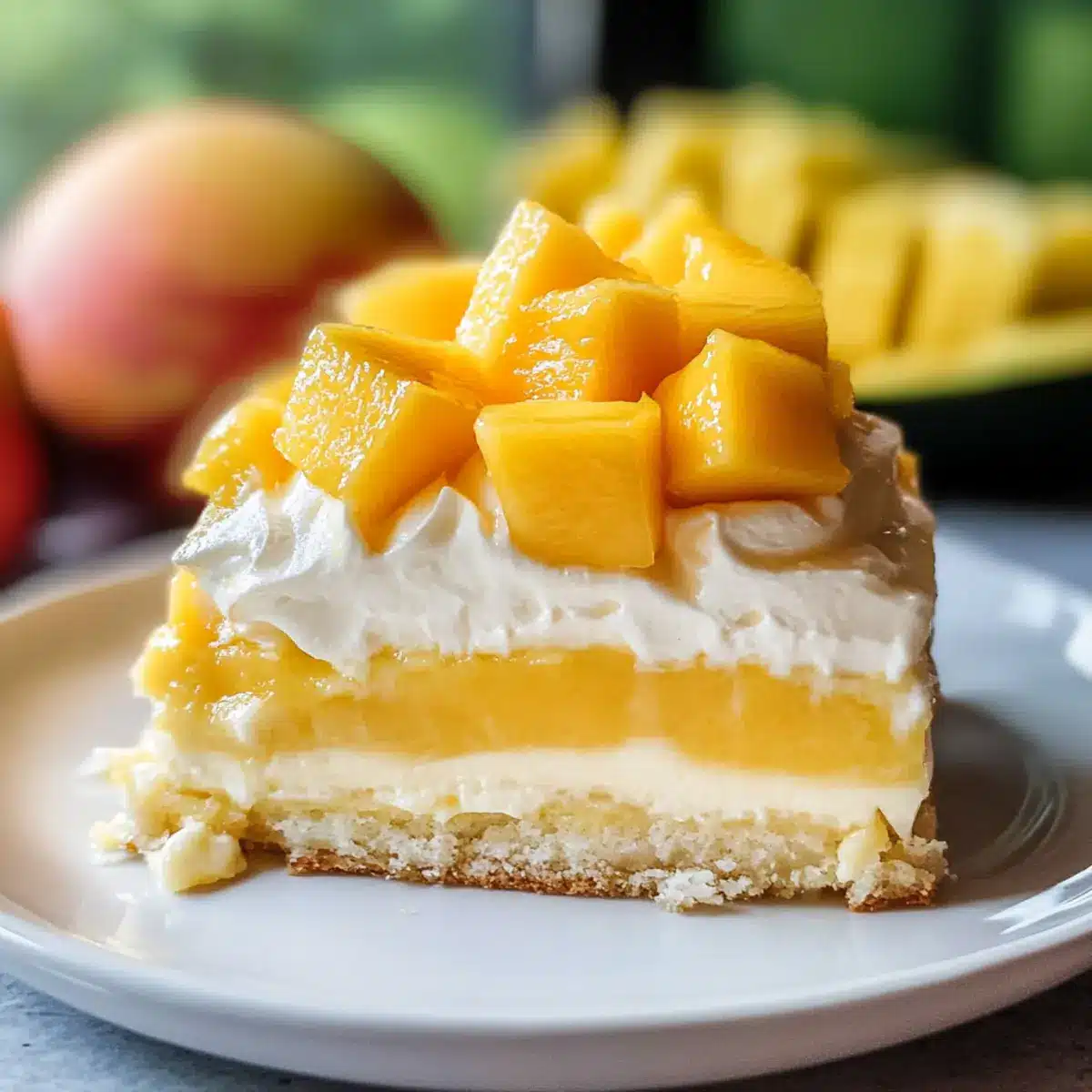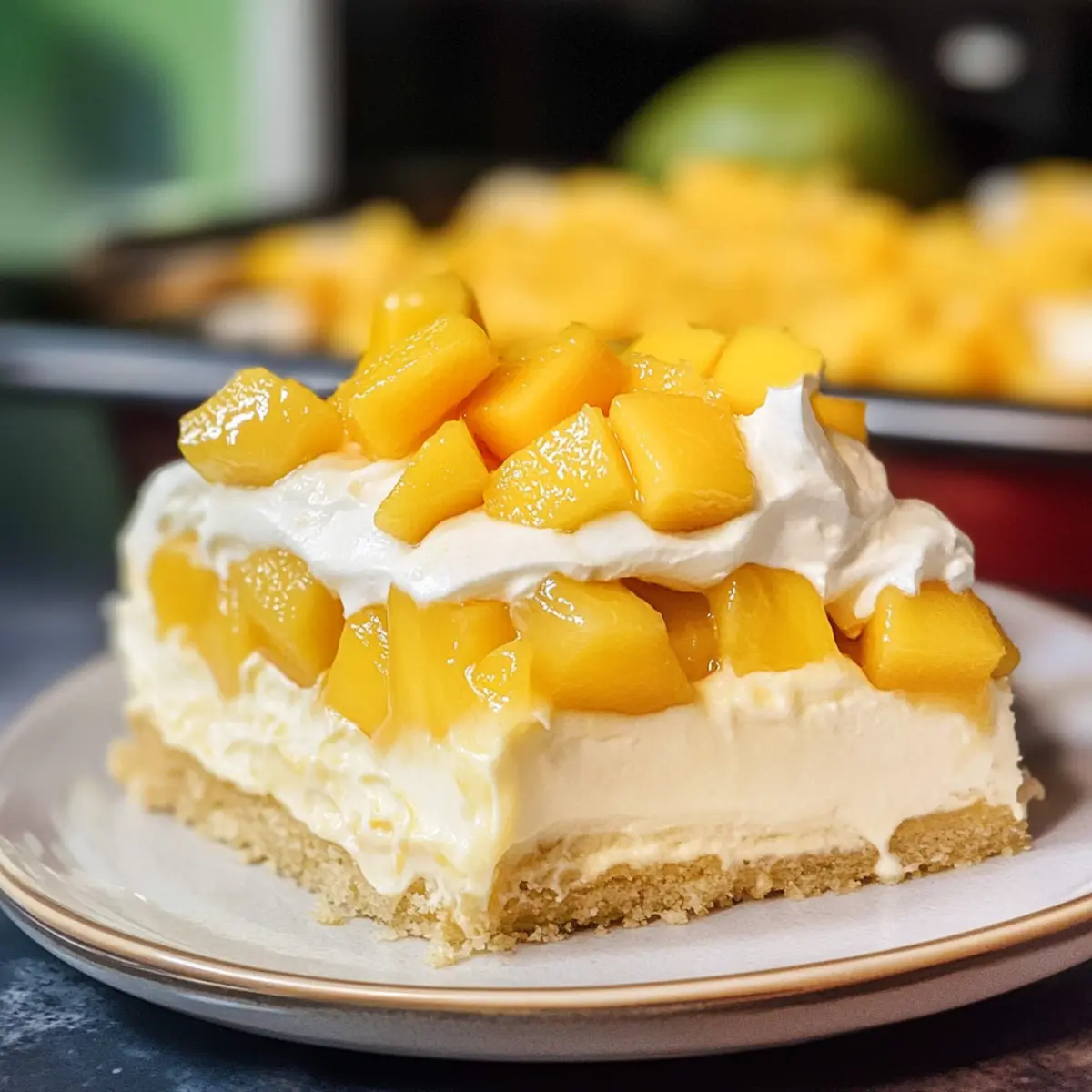 Verteile die mango-infusierte Schlagsahne gleichmäßig auf dem durchtränkten Kuchen. Garniere ihn mit frischen Mangostücken und einem zusätzlichen Drizzle Mango-Püree für eine wunderbare Präsentation. Schneide den Kuchen in Stücke und serviere ihn kühl – ein wahrer Genuss für heiße Sommertage!