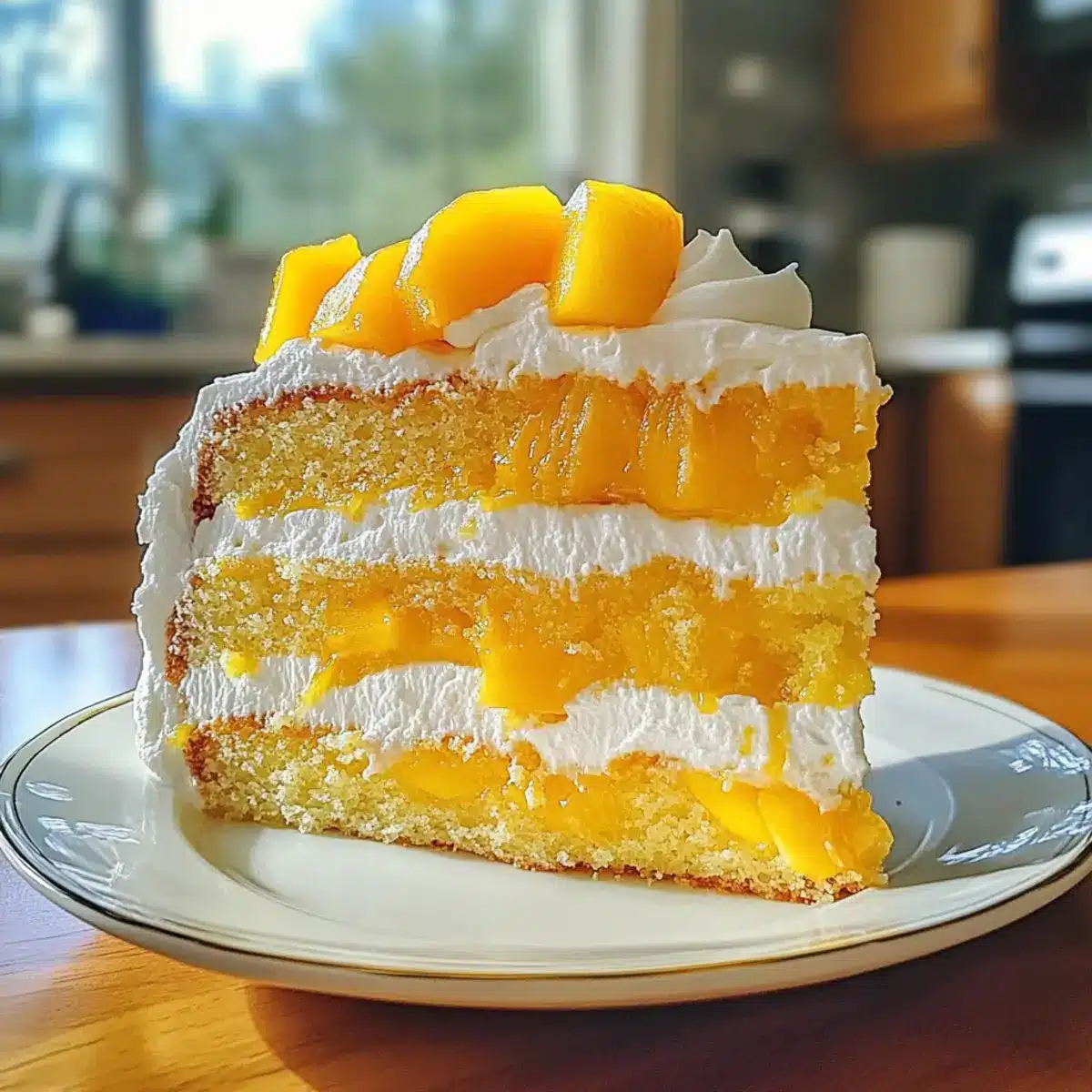 - Kuchen schichten: Eine Kuchenschicht auf einer Servierplatte platzieren, mit Chantilly-Creme und Mangoscheiben belegen und wiederholen.
