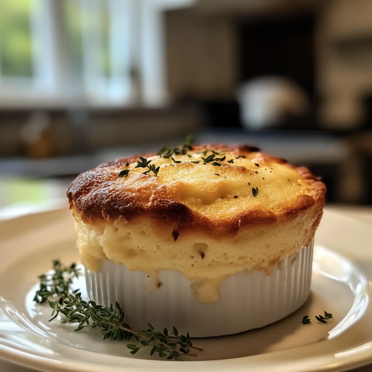 Entferne die Soufflés vorsichtig aus dem Ofen und serviere sie sofort, um die beste Textur zu genießen. Garniere sie nach Belieben mit frischen Thymianzweigen, um eine ansprechende Präsentation zu erzielen. Jetzt kannst du dein Mini Gruyère und Parmesan Käse Soufflé genießen!