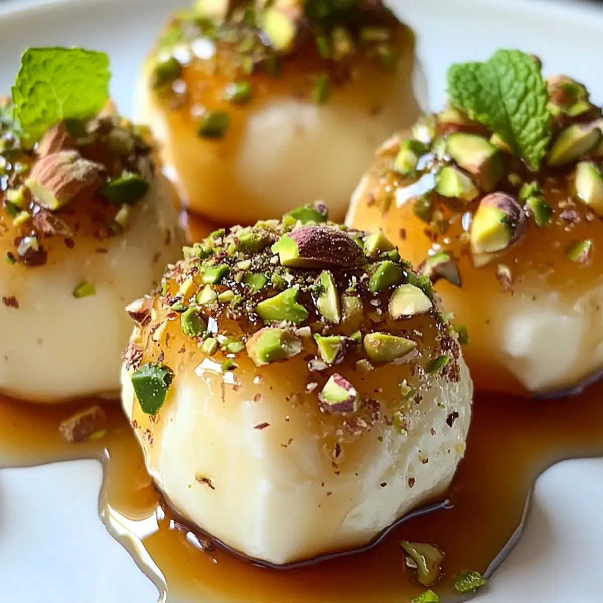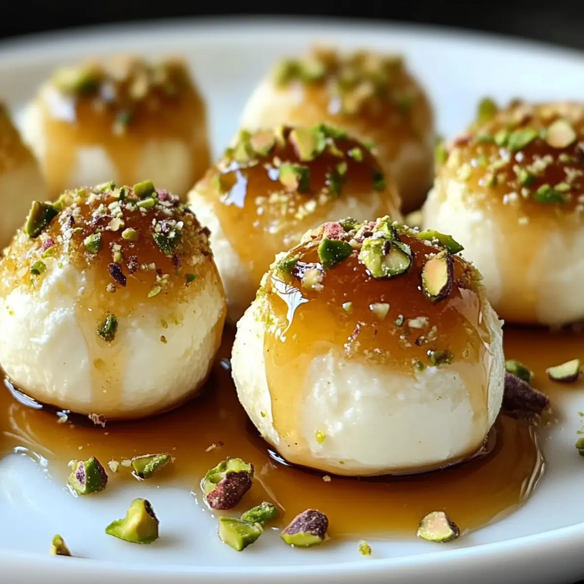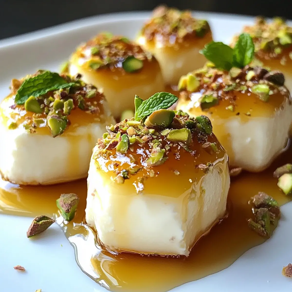 - Garnieren: Träufeln Sie Honig über die Bissen und bestreuen Sie sie mit gehackten Pistazien.