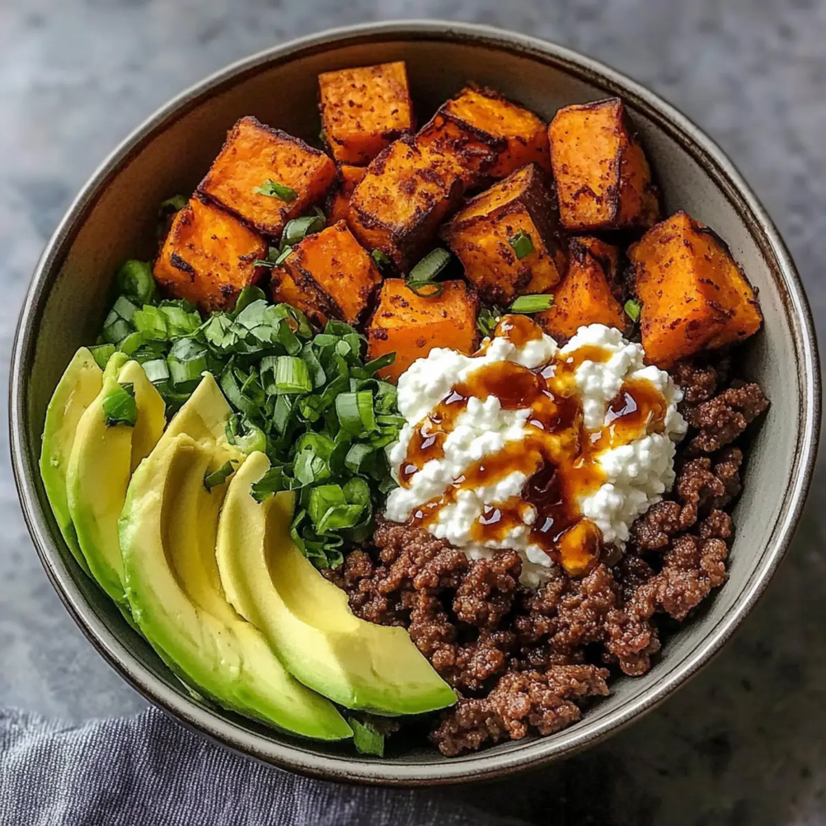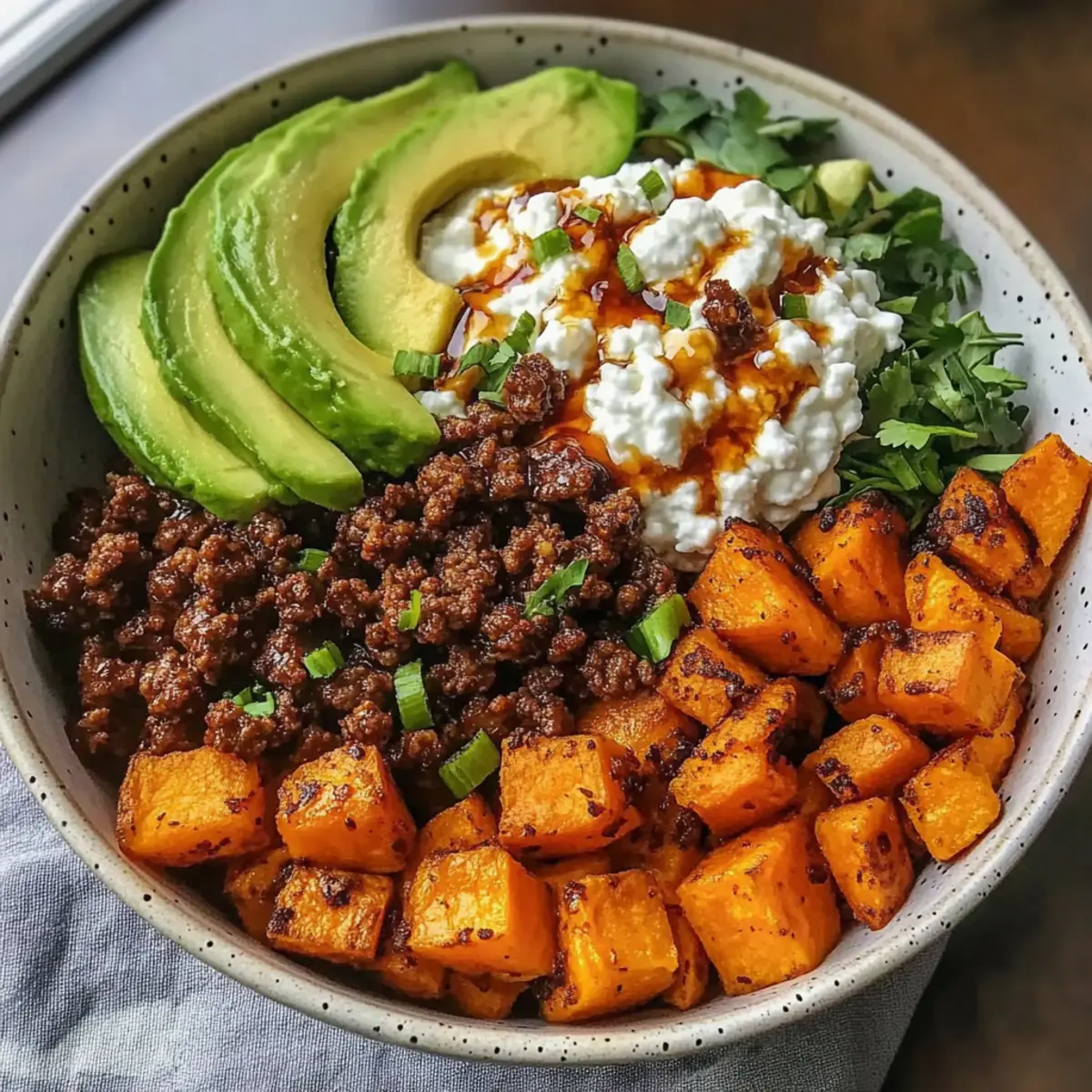 - Staple die Rinderhackfleisch Heißer Honig Schüssel mit gerösteten Süßkartoffeln als Grundlage, gefolgt vom Rinderhackfleisch, Avocadoscheiben und Hüttenkäse.