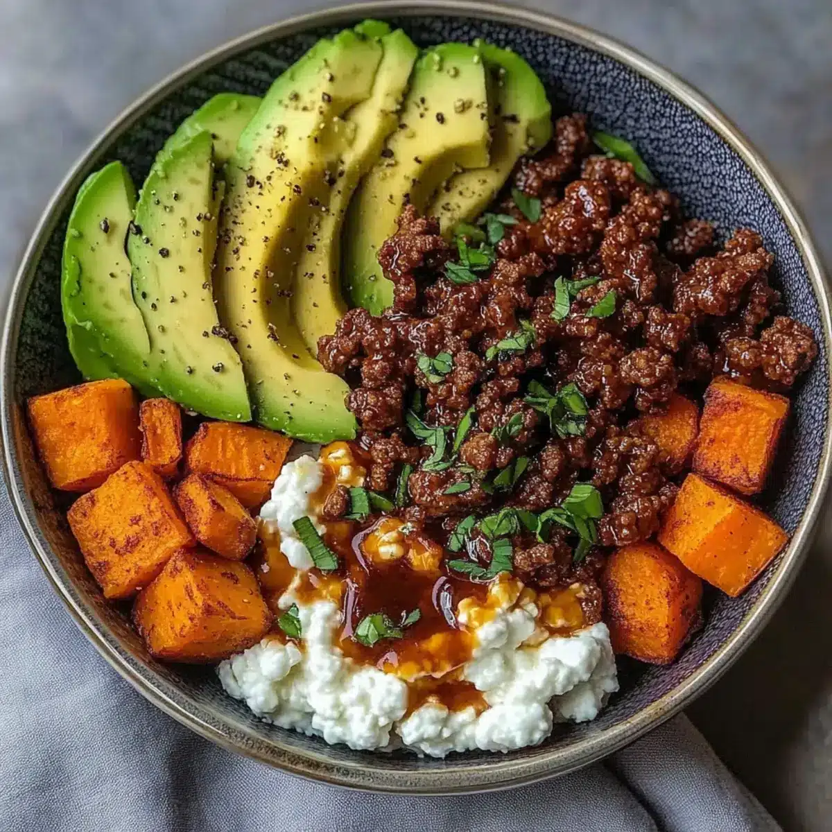 Baue jetzt die Rinderhackfleisch Heißer Honig Schüssel auf. Beginne mit einer Schicht der gerösteten Süßkartoffeln als Grundlage. Füge dann das gewürzte Rinderhackfleisch hinzu und verteile die Avocadoscheiben sowie den Hüttenkäse großzügig darüber. So entsteht eine köstliche Kombination aus Texturen und Aromen, die alle Zutaten perfekt zur Geltung bringt.
