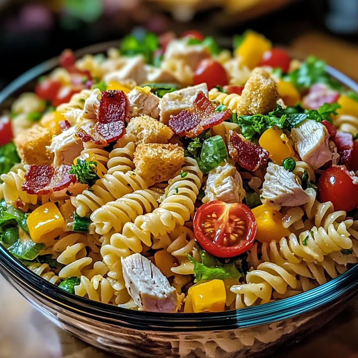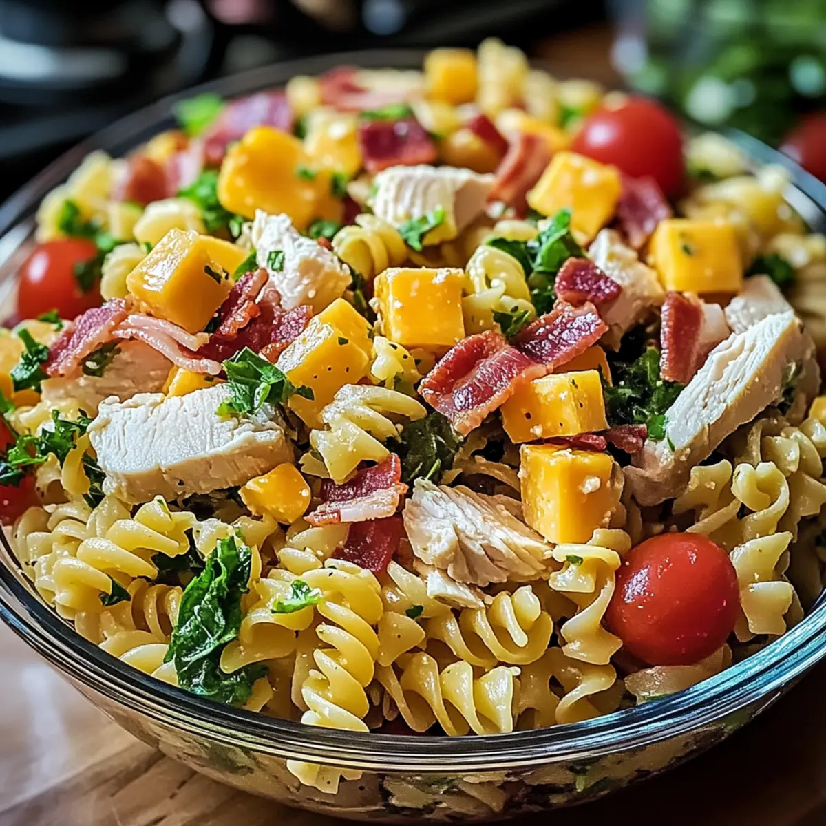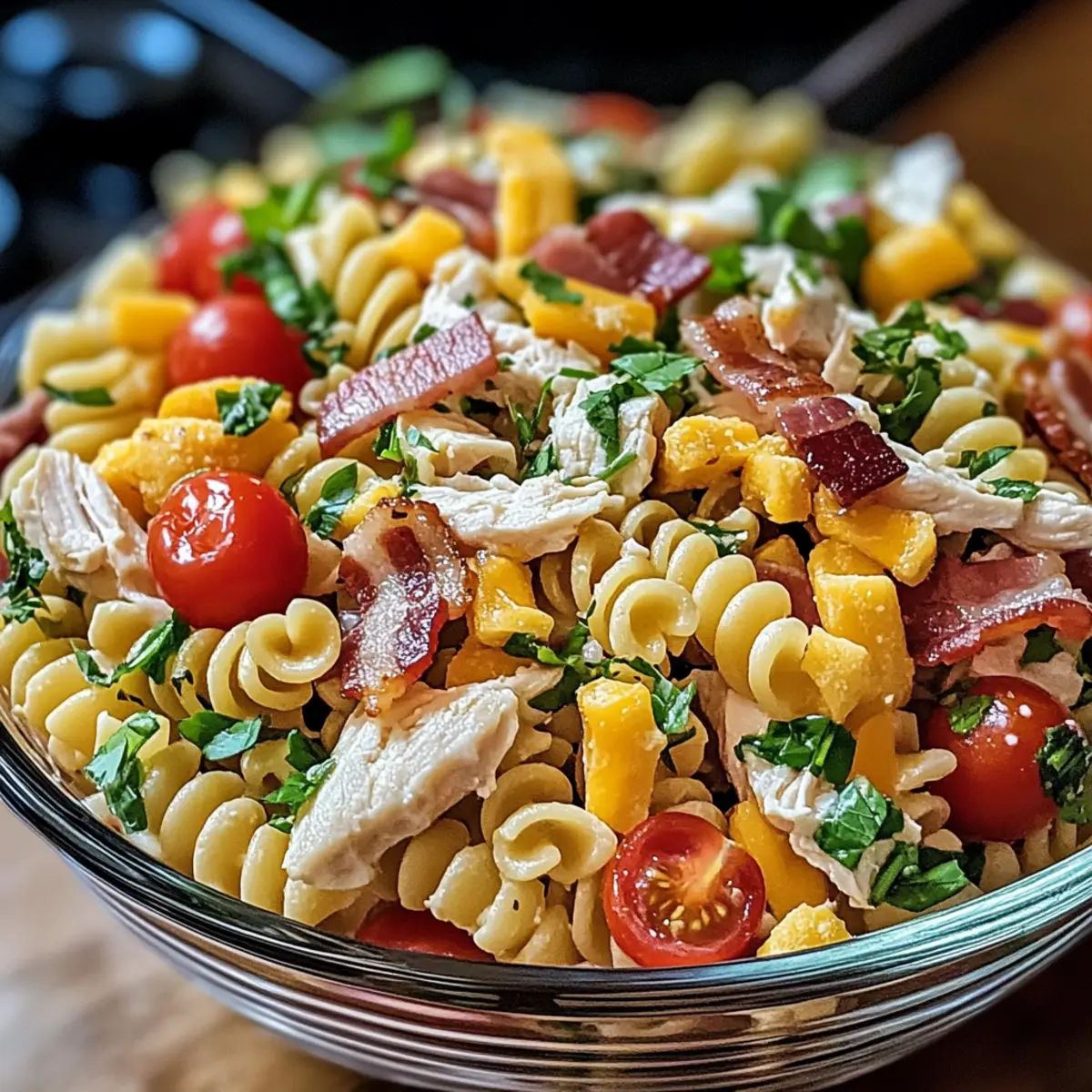 - In einer großen Rührschüssel die gekochte Pasta, gewürfeltes Hähnchen, zerbröselten Speck, halbierte Kirschtomaten, dünn geschnittene rote Zwiebel, gehackten romainischen Salat und geriebenen Cheddar vorsichtig vermengen.