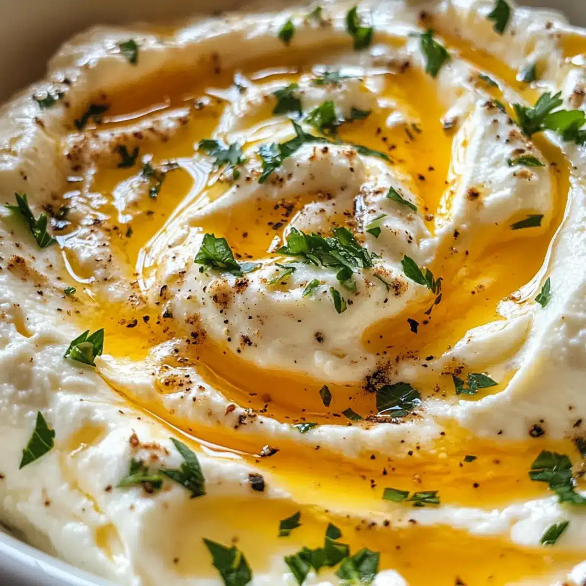 Verteile den cremigen Schafskäse-Dip gleichmäßig auf einem flachen Servierteller und forme mit einem Löffel kleine Wellen und Vertiefungen, um eine ansprechende Präsentation zu schaffen. Diese Struktur ermöglicht es, den heißen Honig besser aufzunehmen, was beim Servieren toll aussieht.