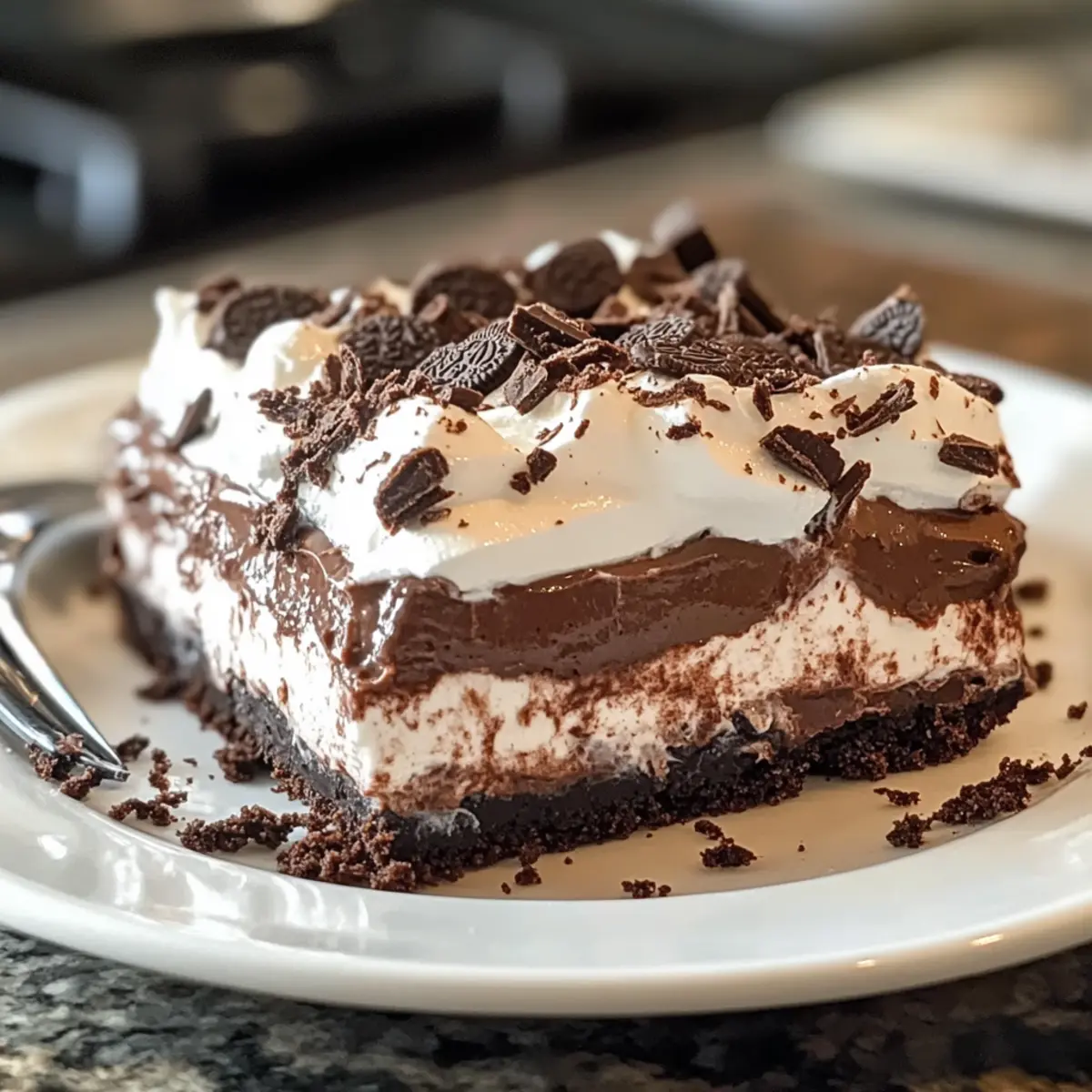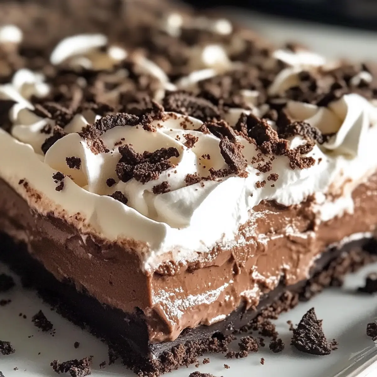 Sobald die Schokoladenlasagne gut durchgekühlt ist, streue die aufbewahrten Oreo-Krümel gleichmäßig über die Cool Whip-Schicht. Verziere die Oberseite mit einem großzügigen Spritzer Schokoladensoße und füge nach Wunsch Schokoladenspäne oder gehackte Schokoladenbonbons hinzu.