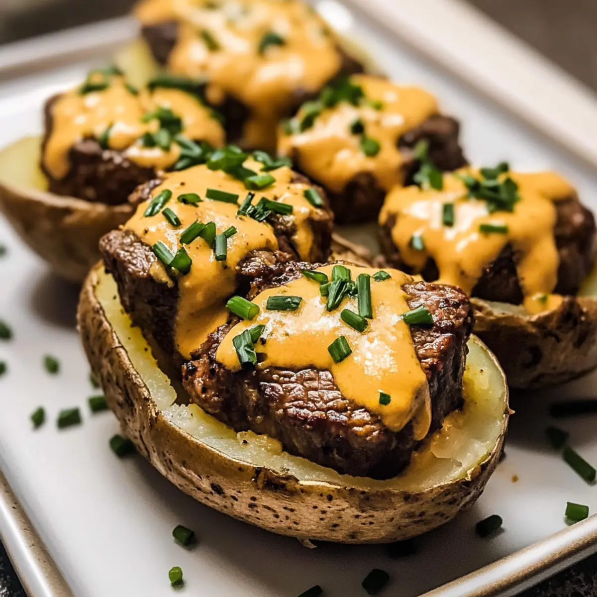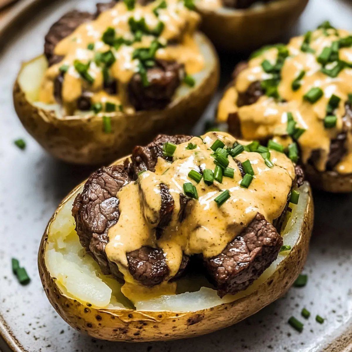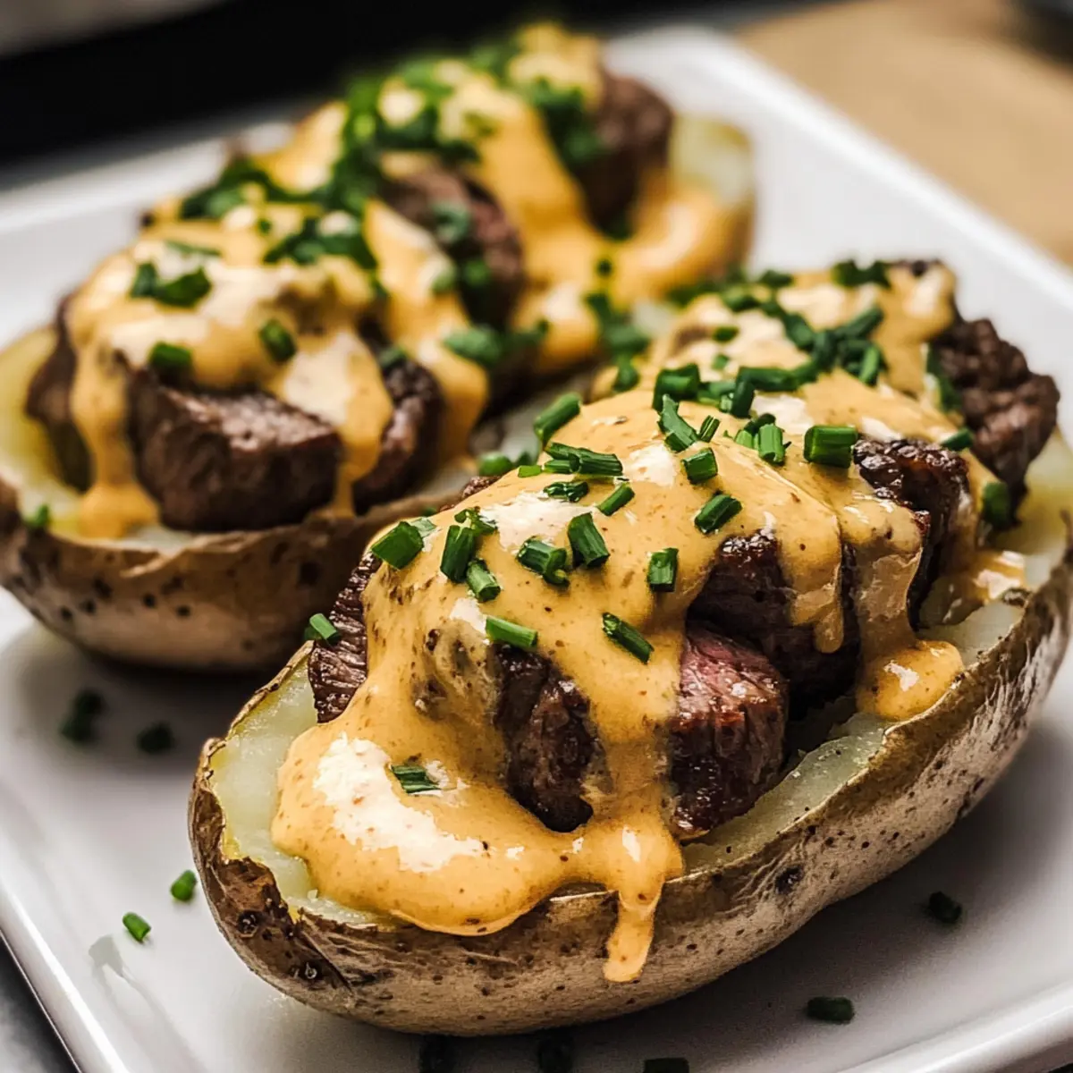 - Schneide die gebackenen Kartoffeln auf, fülle sie mit dem Steak und beträufle sie mit der Käsesauce. Garniere mit Schnittlauch.