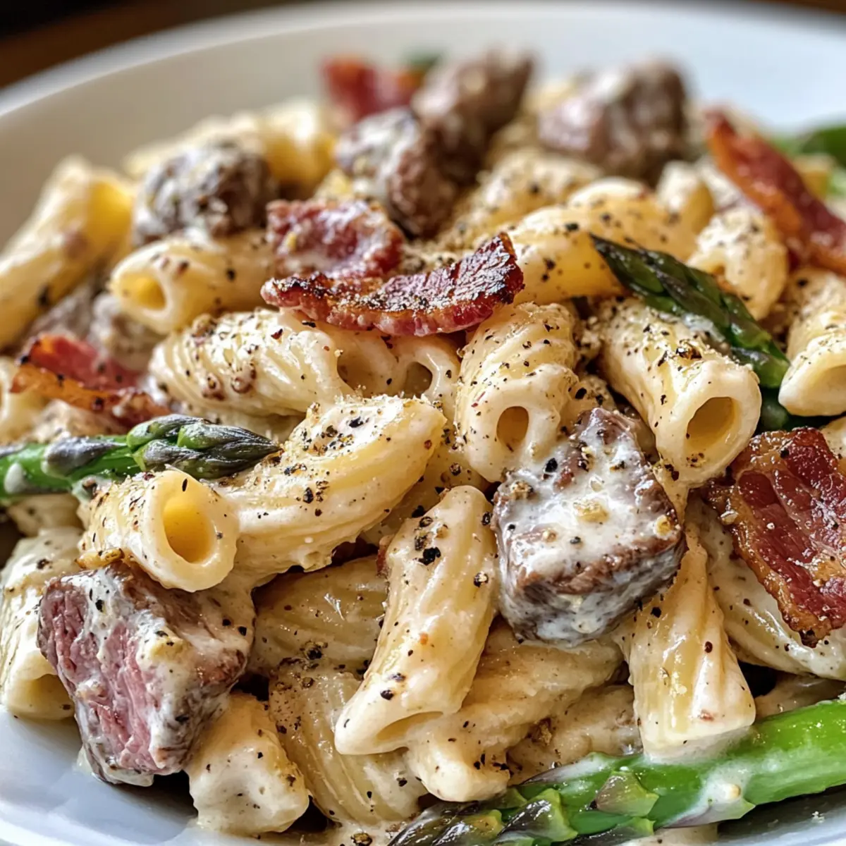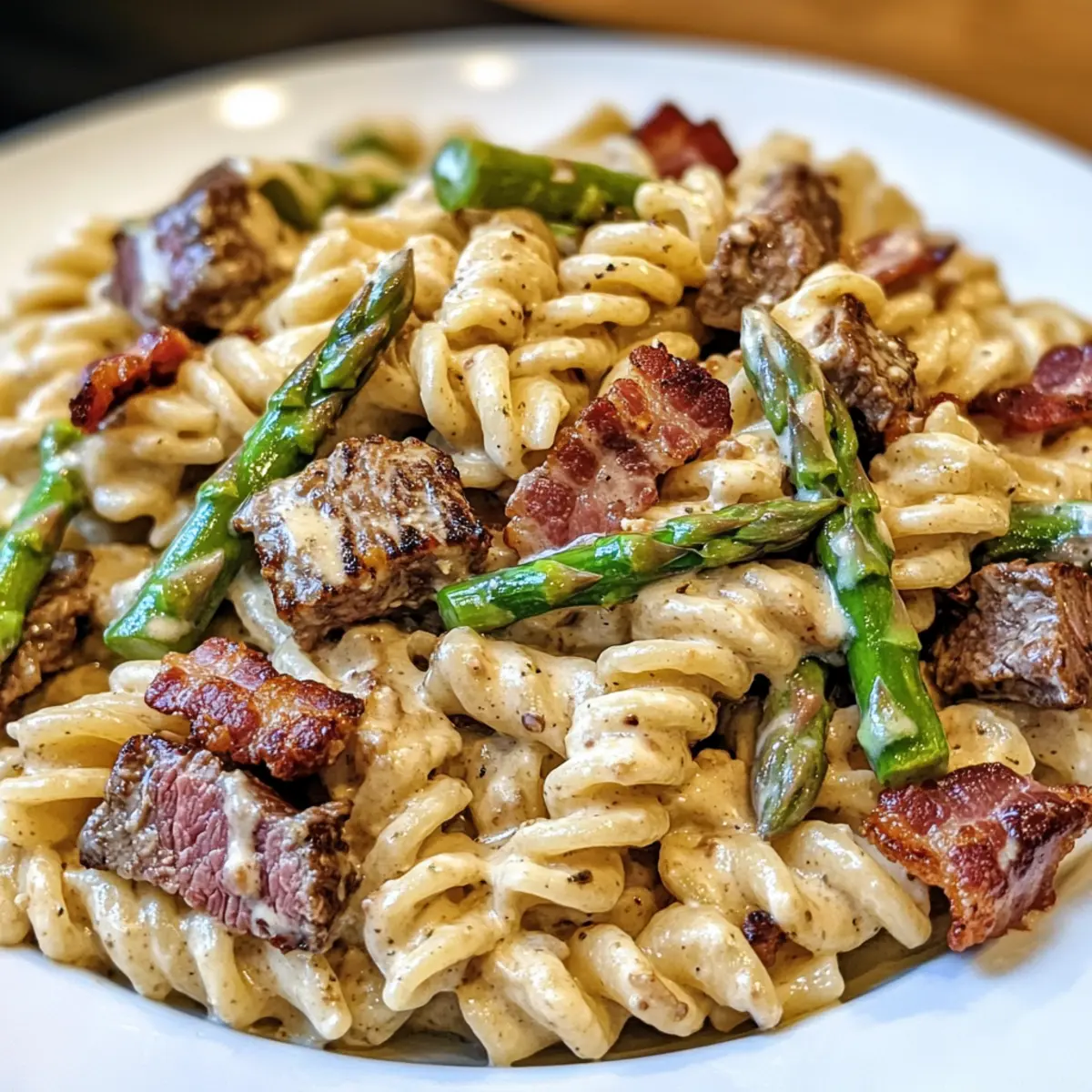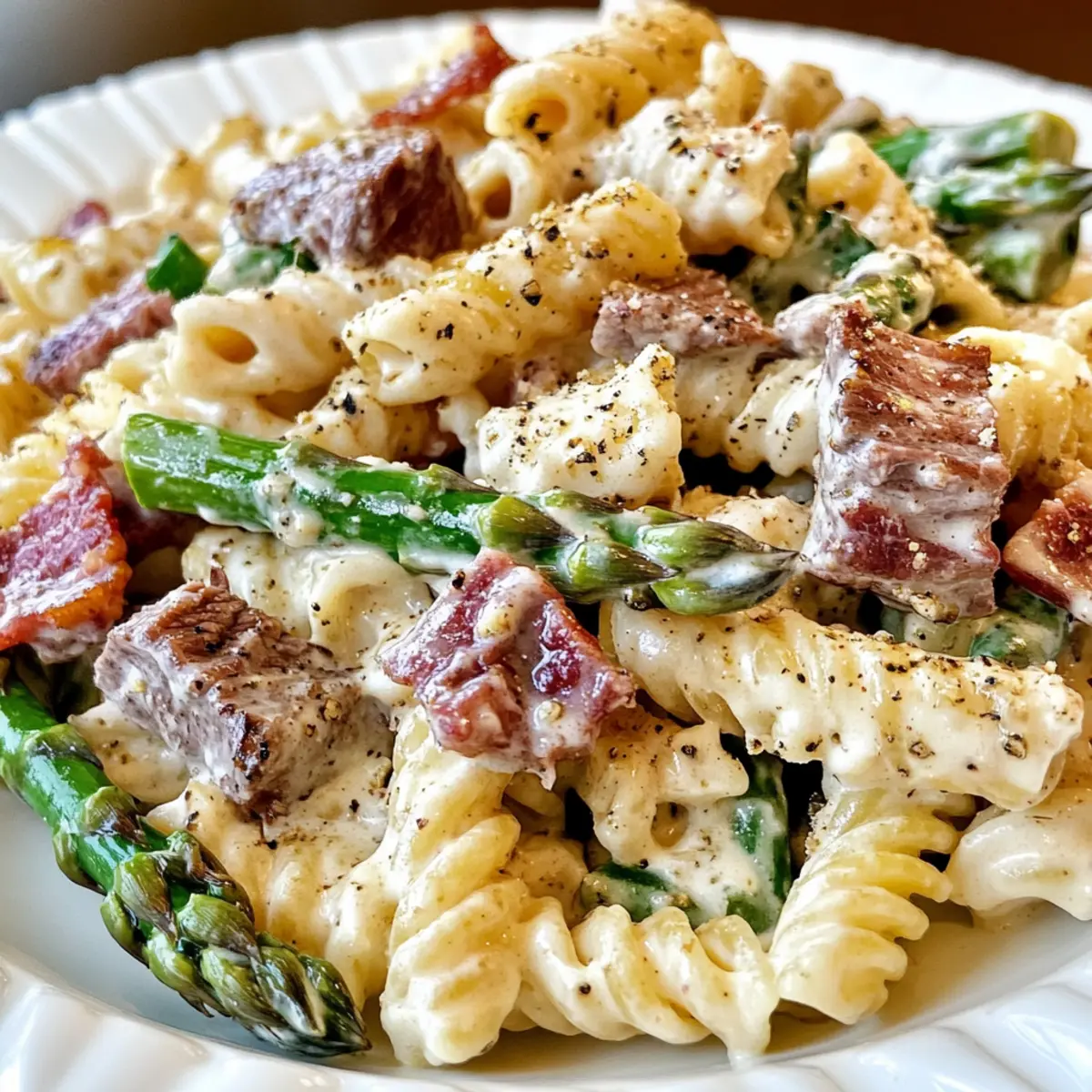 „Hast du noch Reste von einem saftigen Steak im Kühlschrank? Dann wird es Zeit, diese in etwas ganz Besonderes zu verwandeln! Mein Rezept für einen cremigen Steak Pasta Salat mit Spargel und Bacon bringt deinen Feierabend in eine neue Dimension. Diese schmackhafte Kombination aus zarten Steakstücken, frischem Spargel und knusprigem Bacon wird in weniger als 30 Minuten zubereitet und ist perfekt für alle, die nach einer schnellen und leckeren Lösung suchen, um übrig gebliebenes Steak genussvoll zu verwenden. Die cremige Dressing sorgt für einen unwiderstehlichen Geschmack und macht diese Mahlzeit zu einem echten Hit am Esstisch. Bist du bereit, deine Familienmitglieder mit einem ganz besonderen Genuss zu überraschen?”
