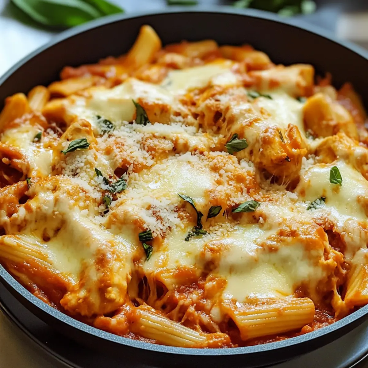 Nehme die Pfanne vom Herd und garniere die Ultimative Hähnchen-Parmesan-Nudeln-Pfanne nach Belieben mit frischen Kräutern wie Basilikum oder Petersilie. Servo die Nudeln heiß auf Tellern und füge bei Bedarf noch etwas zusätzlichen Käse hinzu. Genieße dieses herzliche Gericht mit der ganzen Familie für ein schnelles, köstliches Abendessen.