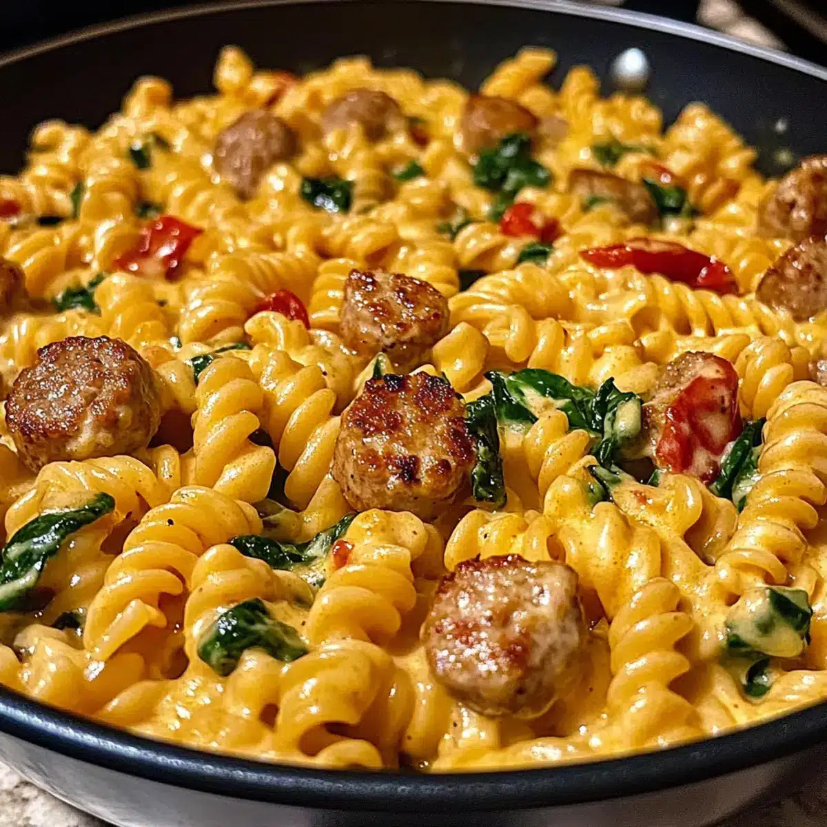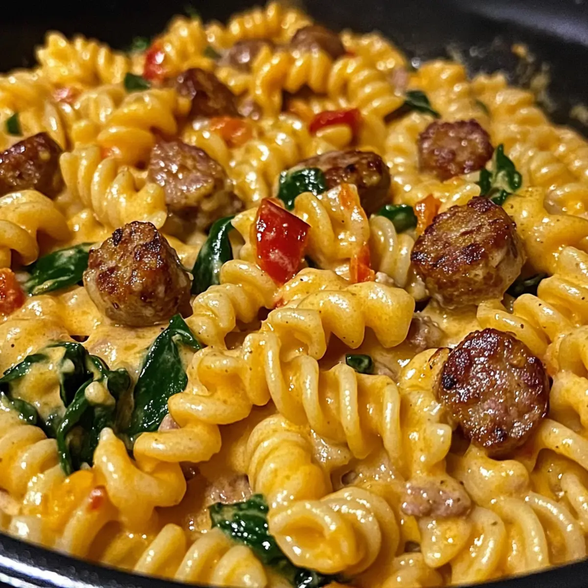 - Falte den frischen Spinat und die gerösteten roten Paprika unter die Pasta. Füge auch die vorher gebräunte Wurst zurück in die Pfanne und rühre alles gut durch.