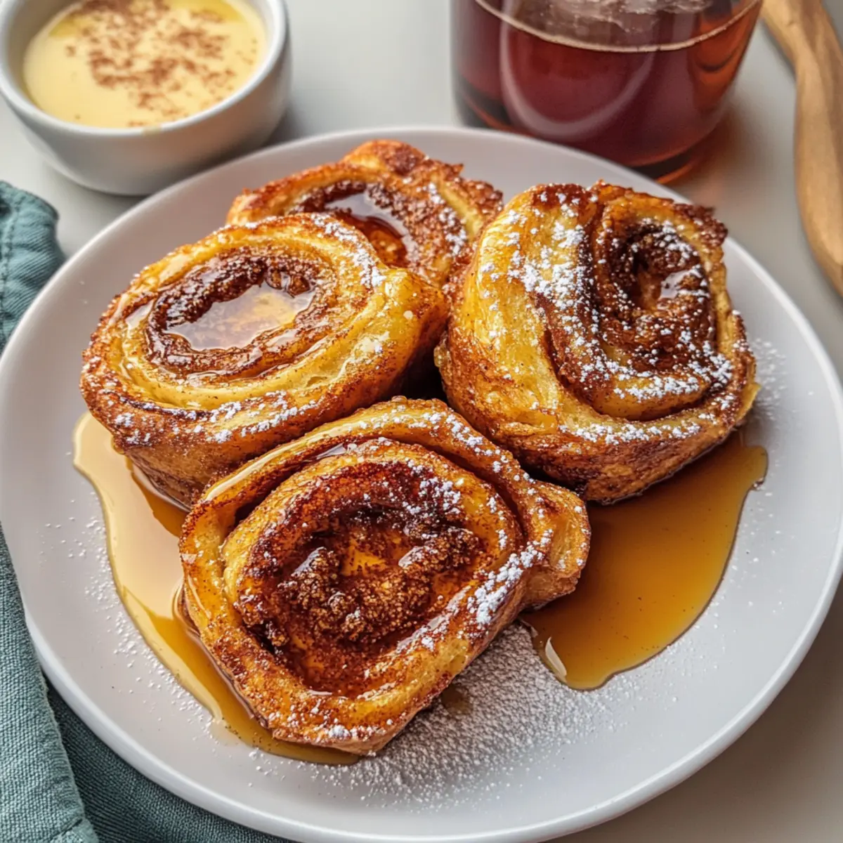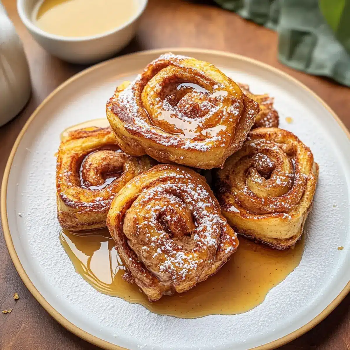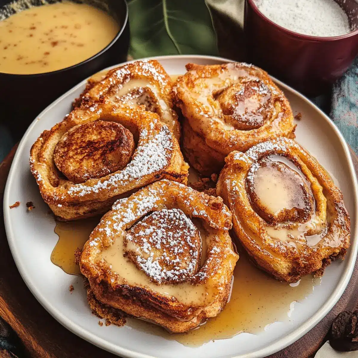 - Platziere die Zimtschnecken-French Toast auf einem Servierteller und garniere sie mit Ahornsirup und Puderzucker.